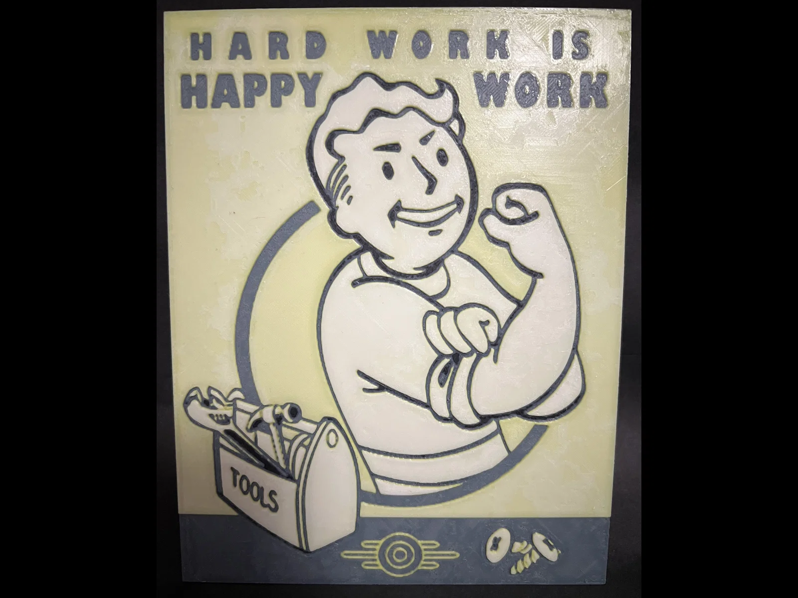 Poster Fallout “Hard Work Is Happy Work” phong cách Vault: hướng dẫn in 100% infill, layer height 0.08mm, kèm danh sách PLA BambuLab và mốc đổi màu theo từng layer để ra đúng hiệu ứng.