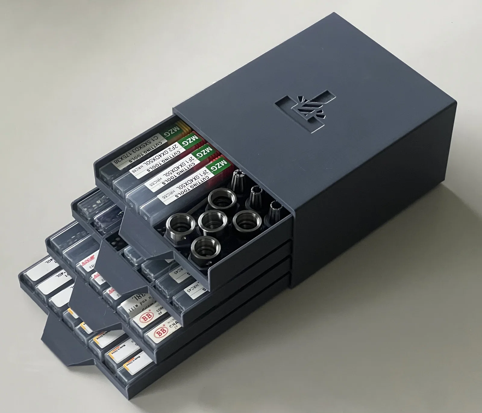Bộ tổ chức này được thiết kế theo dạng tủ nhiều ngăn kéo, giúp tận dụng tối đa không gian bàn làm việc. Mỗi ngăn kéo được chia thành các ô nhỏ vừa vặn, giúp cố định chắc chắn từng chiếc mũi dao phay hoặc collet, ngăn ngừa tình trạng va chạm gây mẻ lưỡi. Thiết kế của nó không chỉ chú trọng đến công năng mà còn rất thẩm mỹ, với cấu trúc tổ ong bền bỉ ở mặt ngoài, tạo vẻ ngoài chuyên nghiệp và hiện đại cho góc làm việc của bạn.