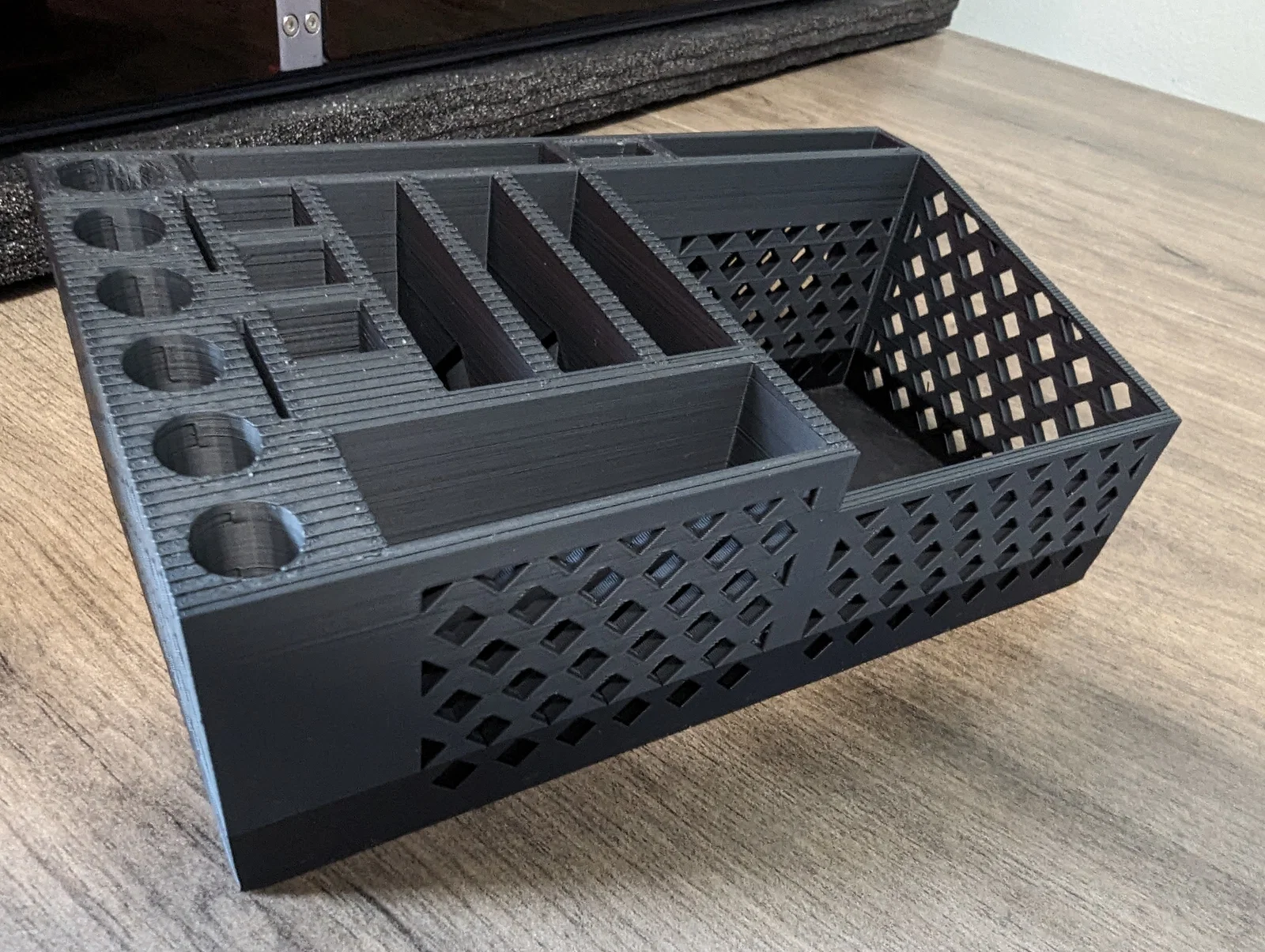 Đang trong quá trình làm (work in progress). Đây là chỗ để mình để một số dụng cụ 3D printing, đồng thời cũng là món trên bàn làm việc để thả tạm vài thứ vào cho gọn. Lưu ý: Các khe được thiết kế theo đúng những dụng cụ mình đang dùng.