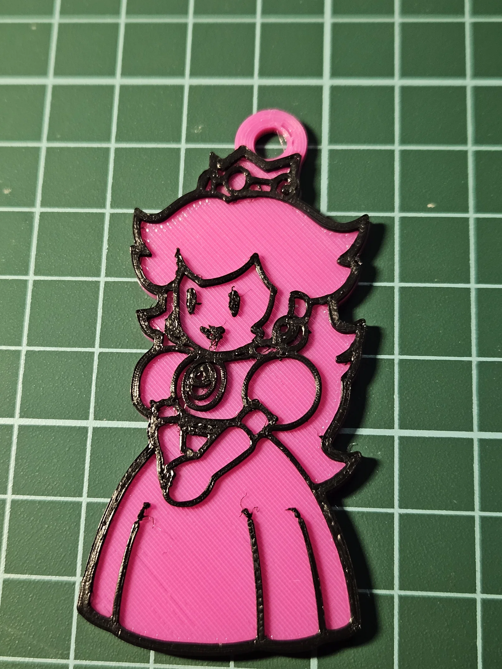 Sản phẩm được thiết kế với kích thước vừa vặn 70x40mm và độ dày 3mm, tạo cảm giác cầm nắm chắc chắn nhưng không hề nặng nề khi treo cùng chìa khóa xe hay móc khóa nhà. Điểm nhấn của mô hình nằm ở sự kết hợp màu sắc tương phản giữa phần nền màu hồng đặc trưng của công chúa Peach và các đường nét viền màu đen nổi bật. Sự phân lớp rõ ràng giữa màu nền (2mm) và đường viền (1mm) tạo hiệu ứng hình ảnh 3D nổi khối rất bắt mắt, làm cho chiếc móc khóa trông có chiều sâu và sắc nét hơn hẳn các loại móc khóa thông thường.