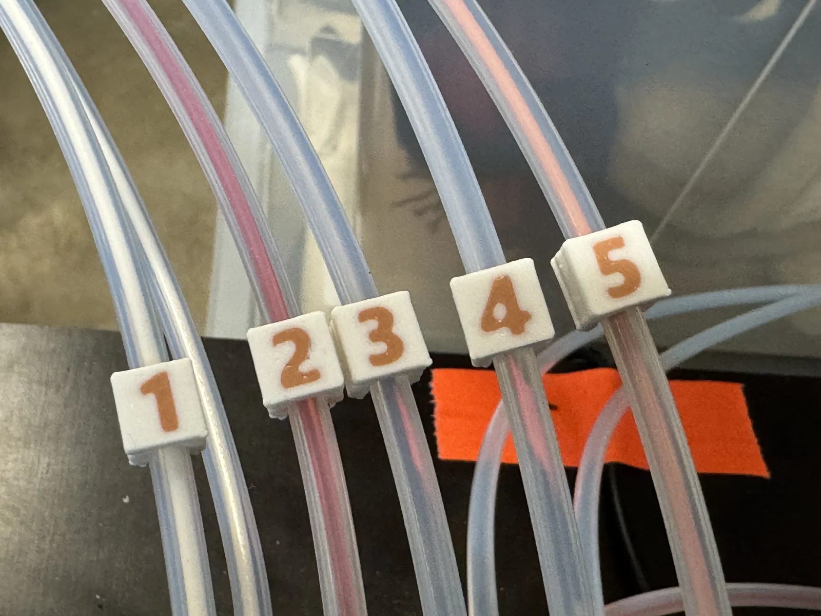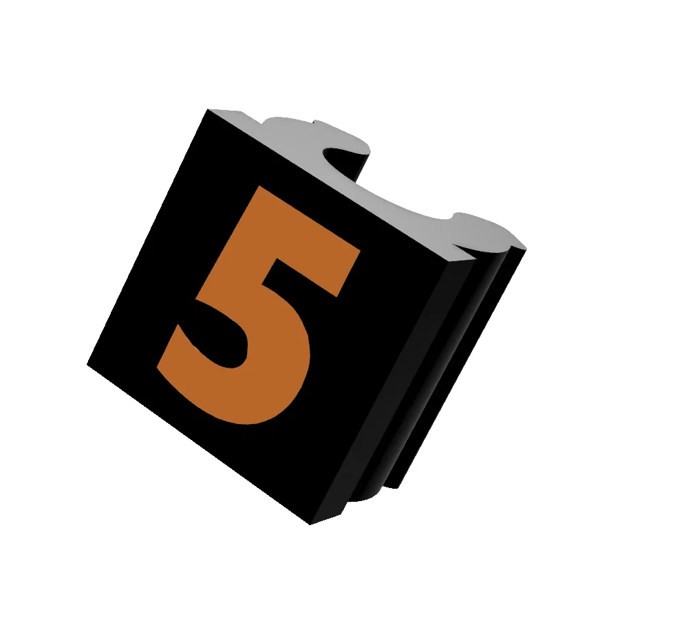 Bộ clip đánh số từ 1 đến 5 để nhận diện nhanh các ống PTFE của MMU. Có thể in single-color bằng cách bỏ STL có số; muốn kẹp chắc hơn thì in dựng cạnh, đổi lại thời gian in lâu hơn và mặt số kém đẹp hơn.