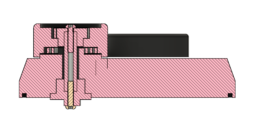 Trên nắp còn có một boss tròn đường kính 30mm, cao 2mm, và bên dưới cần có một rãnh âm tương ứng. Boss này đóng vai trò làm chốt/pivot cho cần, còn rãnh ở mặt dưới cần đóng vai trò như một light trap phụ, vì có dư phòng thì vẫn tốt.