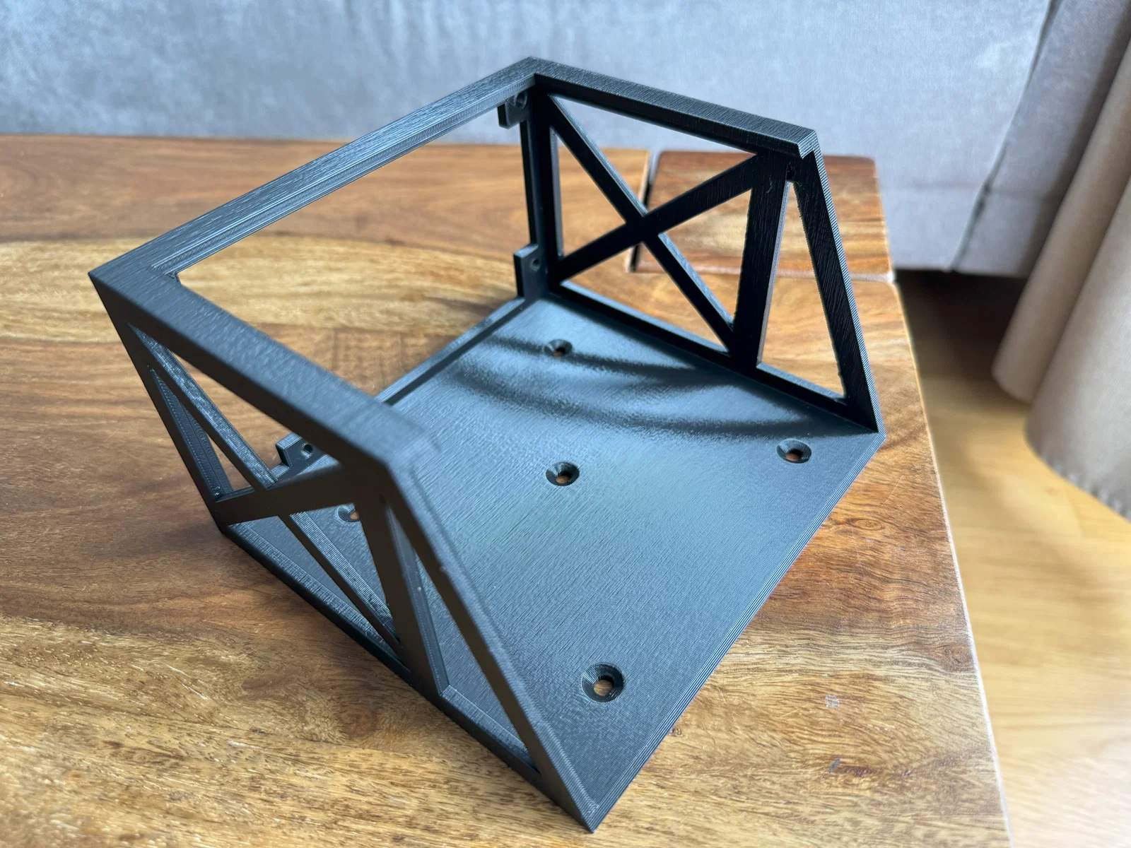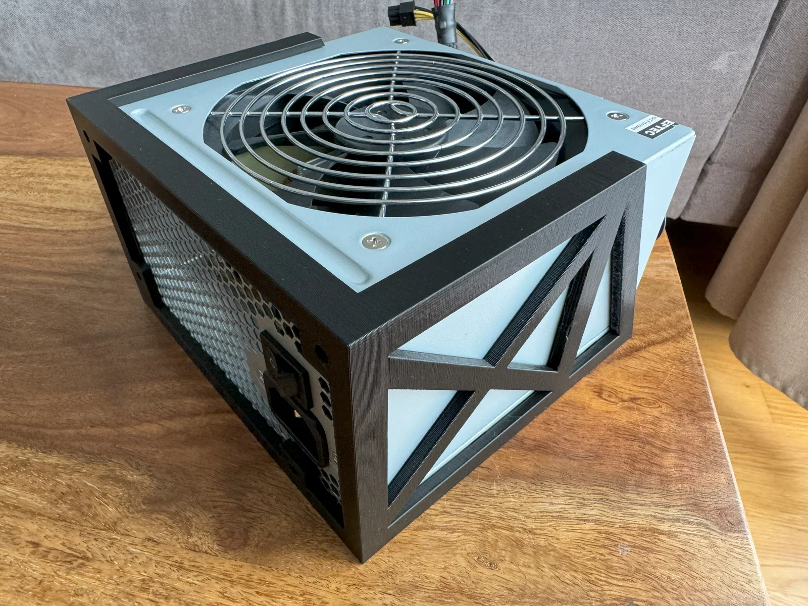 Khung/giá đỡ giúp gắn nguồn ATX lên bề mặt phẳng (ví dụ mặt trên tủ). In bằng PLA+ cho độ chắc tốt. Khuyến nghị đặt mẫu nằm nghiêng cạnh cửa thoát gió khi in để tăng độ cứng và bền.