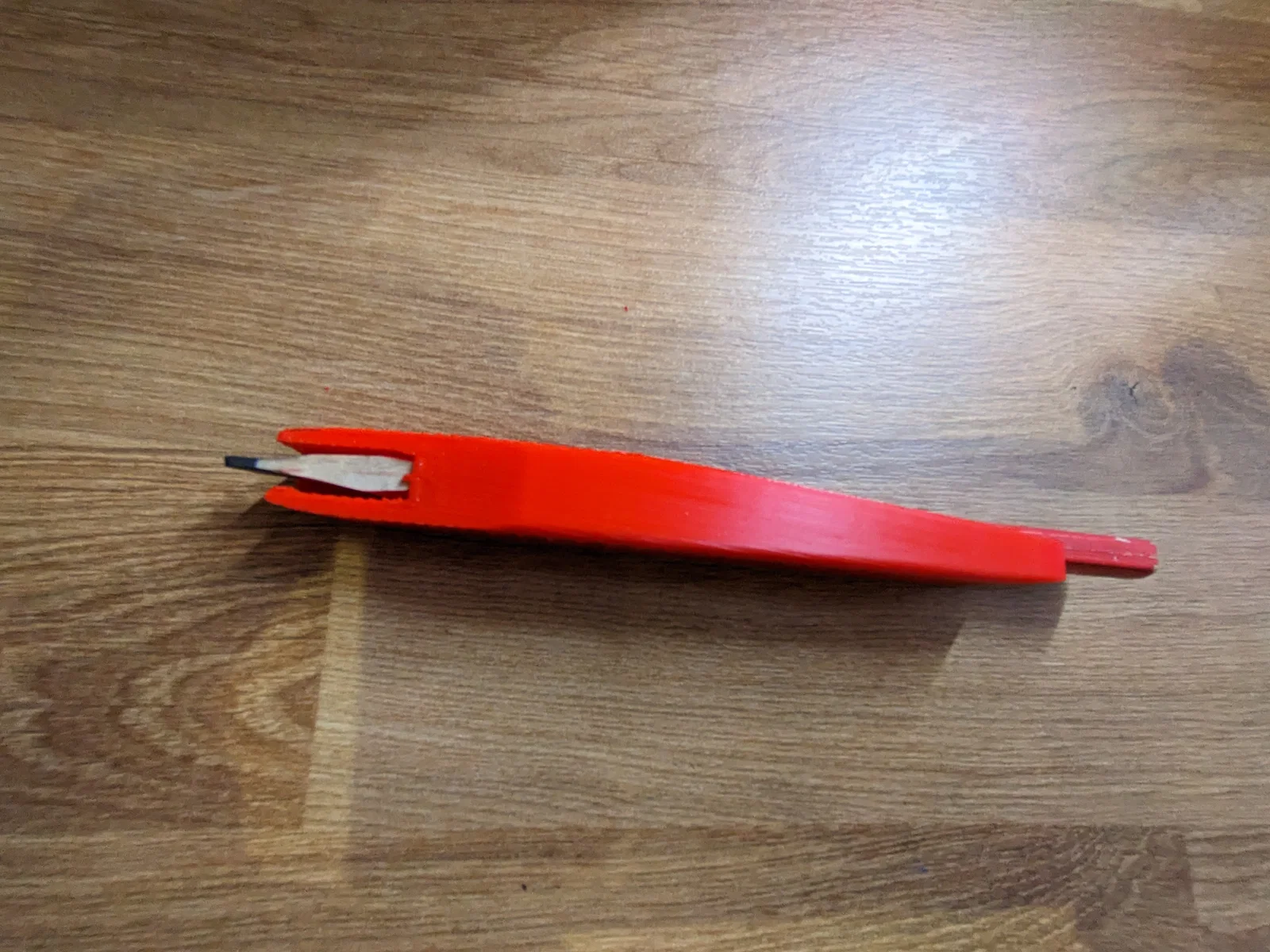 Dụng cụ đơn giản giúp gọt bút chì thợ mộc dễ và đều hơn. Đặt lưỡi dao tỳ theo rãnh dẫn, gọt lần lượt mặt rộng rồi đến mặt hẹp. Có thể chỉnh tham số length trong slicer để rút ngắn cho bút chì ngắn.