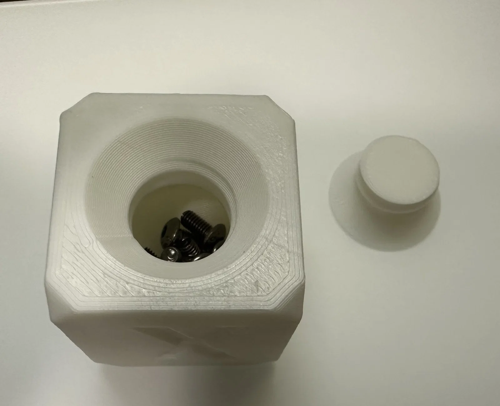 Orca Calibration Cube là khối calibration dạng functional: in xong không bỏ phí mà dùng để đựng ốc vít, bu-lông nhỏ. Hơi kén cài đặt, nhưng chỉ cần calibration theo hướng dẫn là in đẹp và vặn nắp mượt.