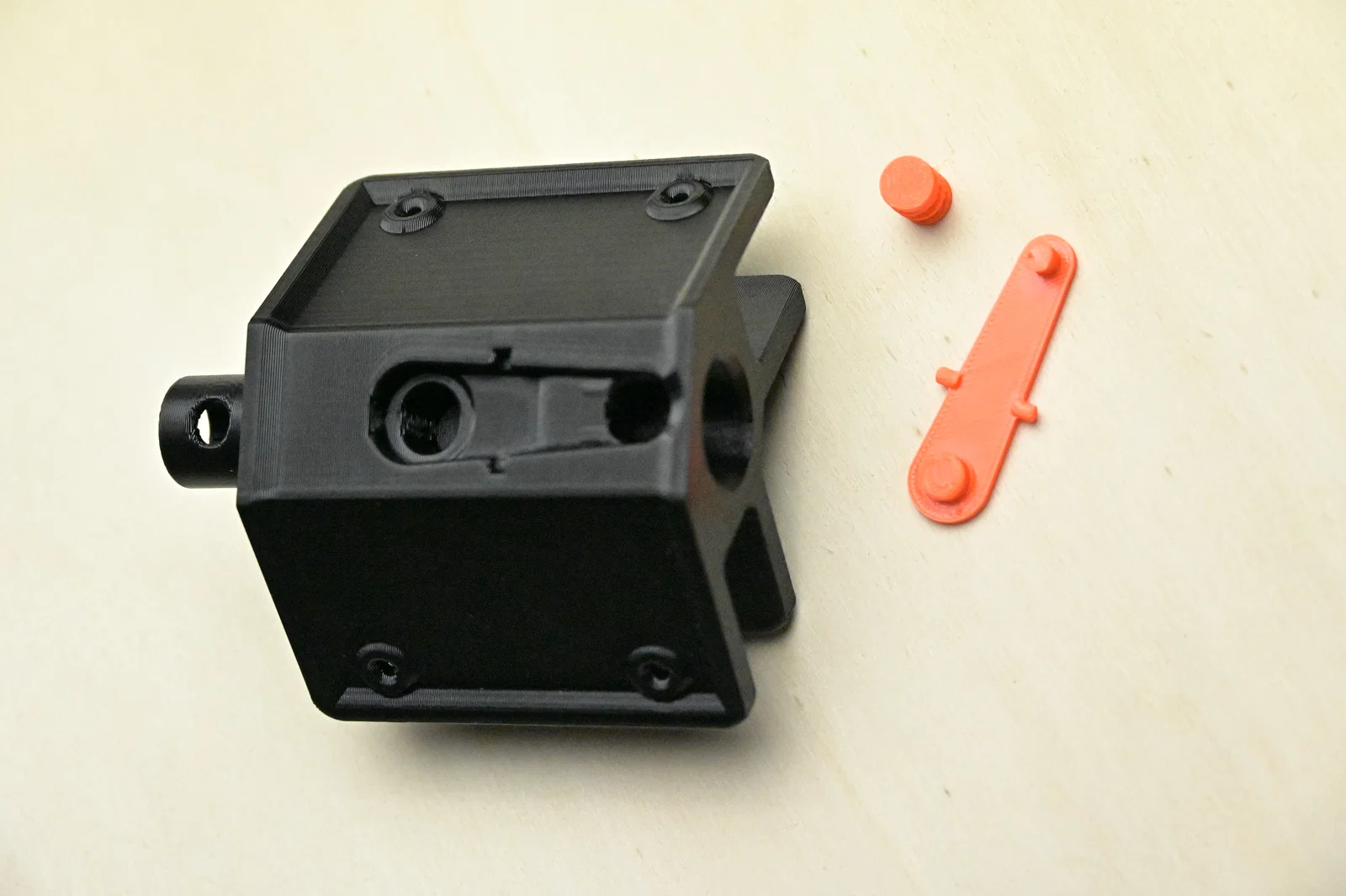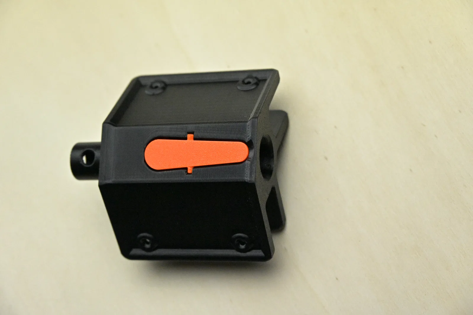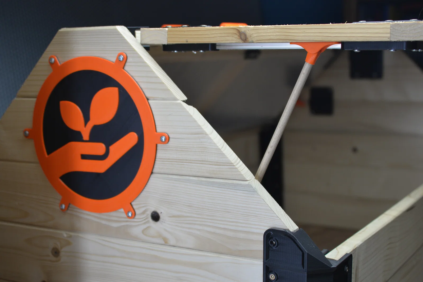 Module cuối cùng bạn có thể thêm là phần mái có thể mở được từ hai phía. Bản lề cũng là chi tiết in 3D và có thể in liền khối. Dung sai khít đảm bảo mái che đóng mở chắc chắn. Thanh ngang được lắp qua rãnh đuôi én (dovetail). Các đầu nối (logo) giúp liên kết các tấm ván ở đầu hồi mái.