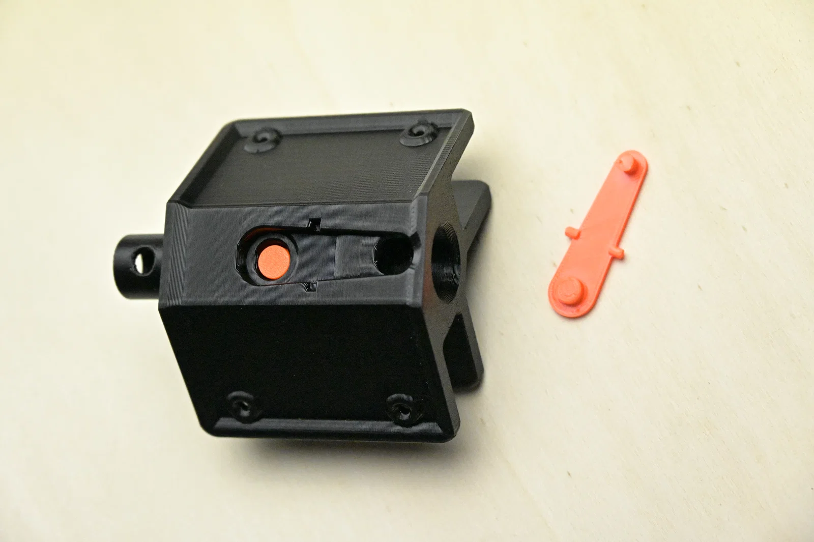 Khi lắp cơ chế khóa, hãy nhét lò xo vào, lắp cần gạt từ bên hông rồi đẩy vào. Cuối cùng, gạt thử vài lần cho trơn tru.