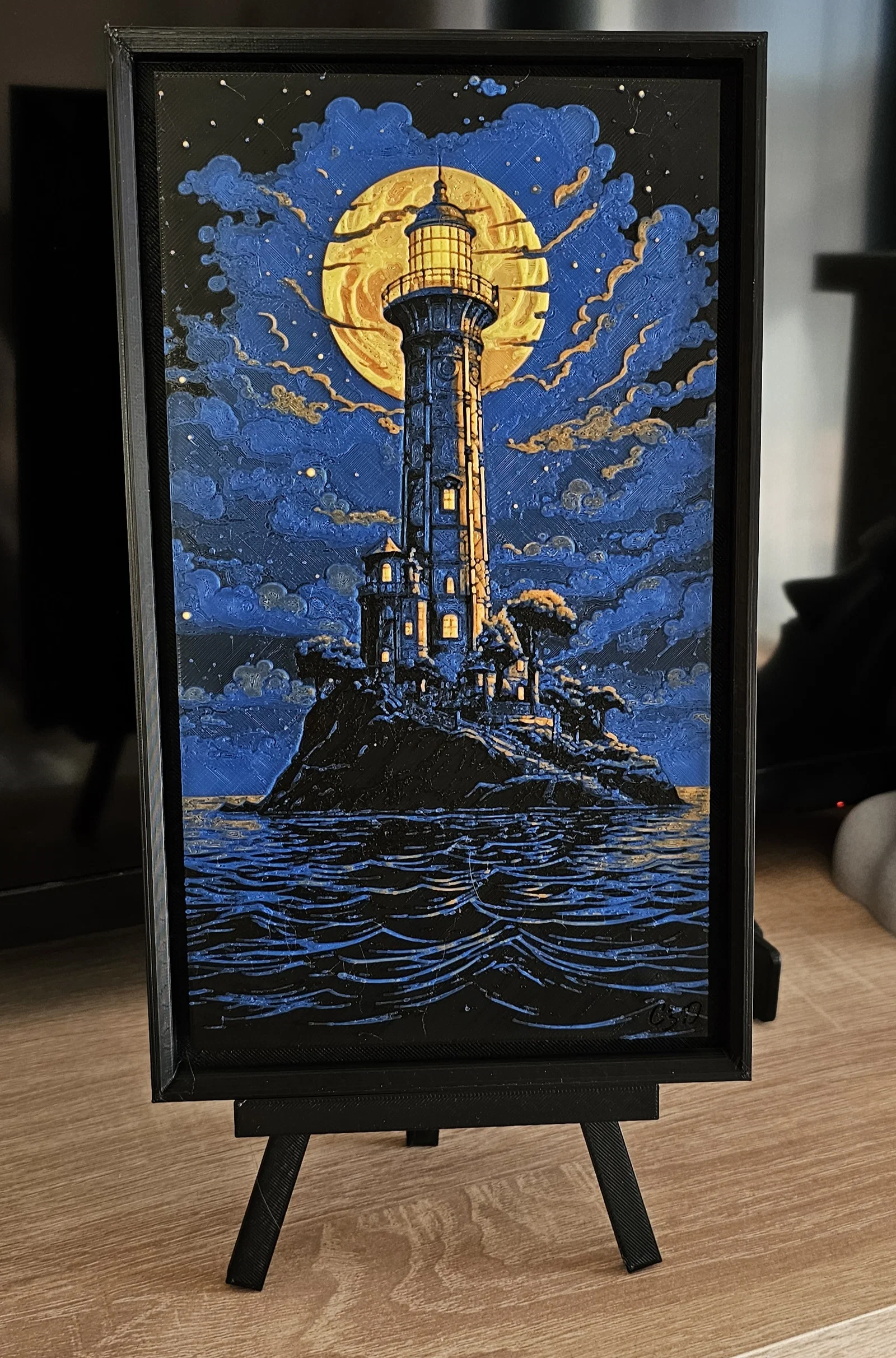 Bức tranh HueForge chủ đề biển với hình hải đăng, thuộc series Sea. In 100% infill, layer height 0.08mm (base 0.16mm) và đổi màu theo các mốc layer đã hướng dẫn với PLA BambuLab.