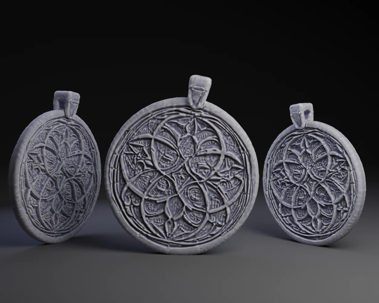 Mẫu Gothic Tracery Pendent/Earrings với phong cách gothic, tracery dạng basrelief. Tác giả có kèm link LoRa dùng cho stable diffusion và chia sẻ việc test output với displacement.