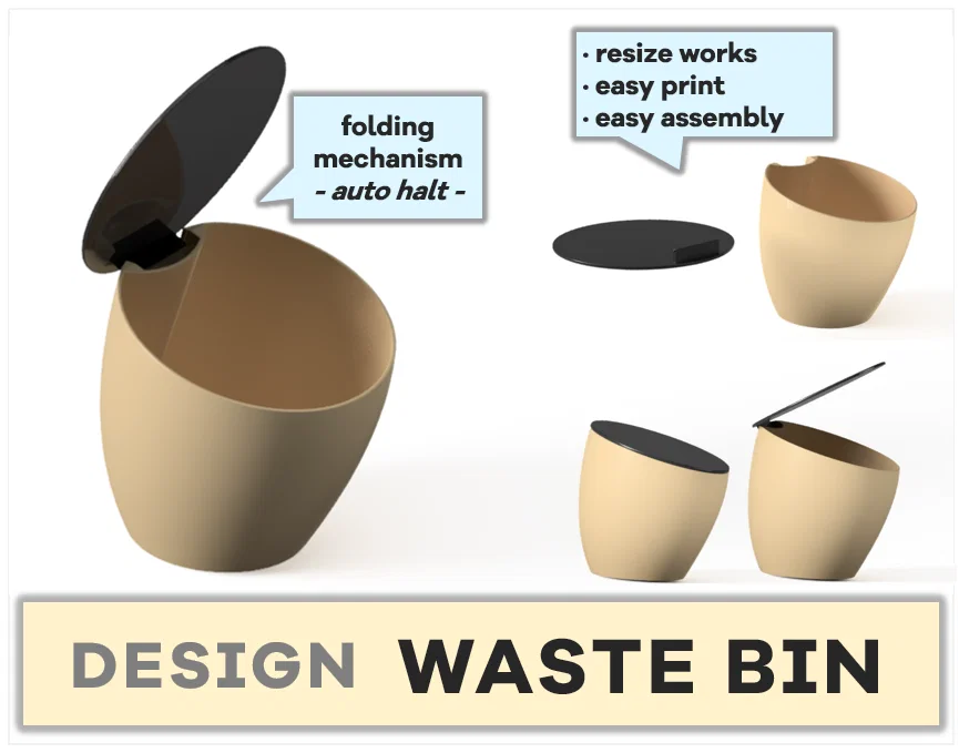 Mẫu thùng rác (trash bin) thiết kế 2 mảnh gồm thân và nắp, gọn gàng cho bàn làm việc, makerspace hoặc mặt bếp. Miệng lớn, không cần túi rác, dễ nhấc và dễ vệ sinh; có thể resize theo tỉ lệ.