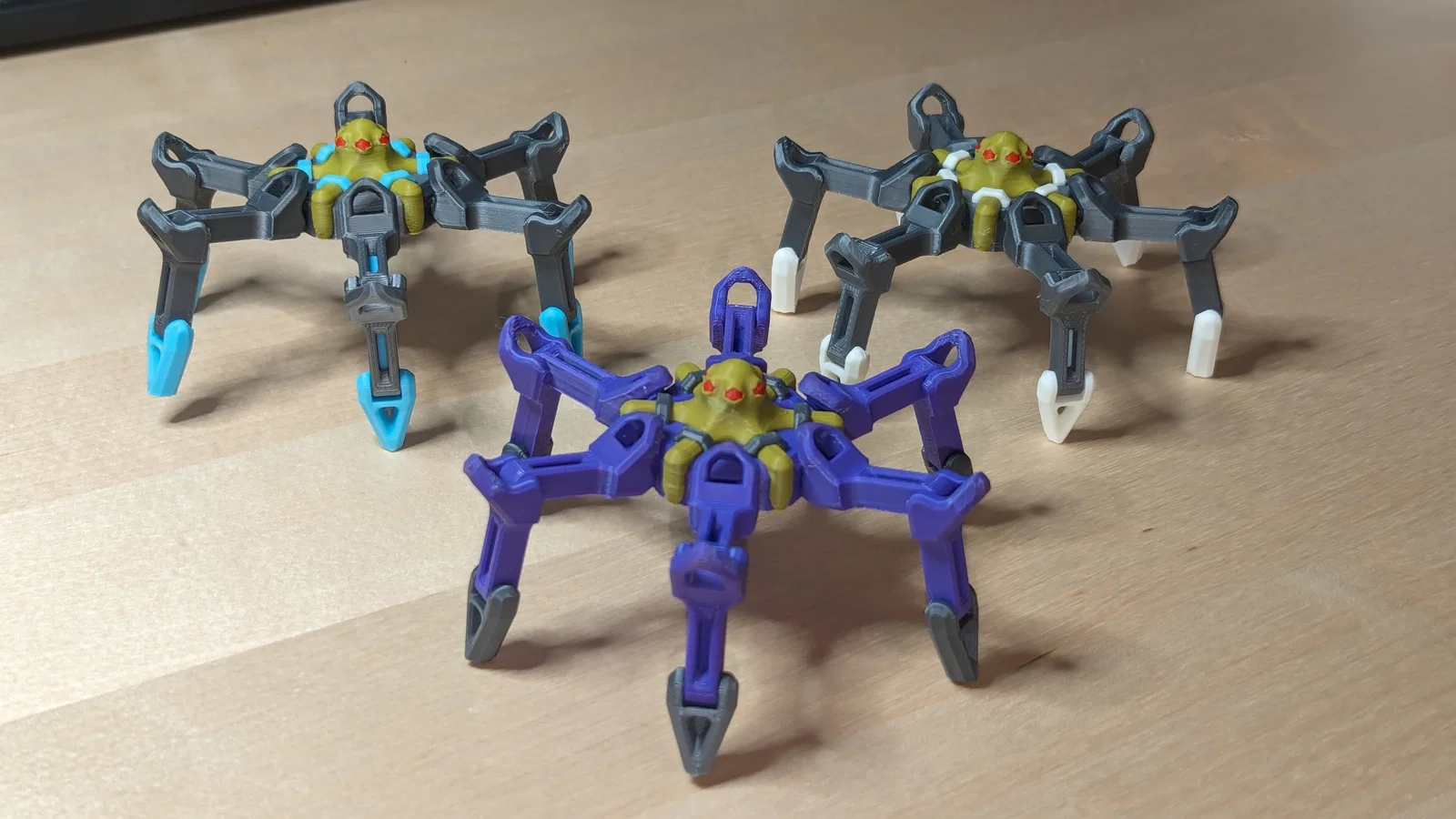 Hexapod alien đối xứng hướng tâm, in print in place, tạo dáng linh hoạt và không cần lắp ráp. Có STL bản thường và 3MF đa màu kèm adaptive layer height. Hinge mặc định 0.1mm, có thể chỉnh bằng XY Size Compensation.