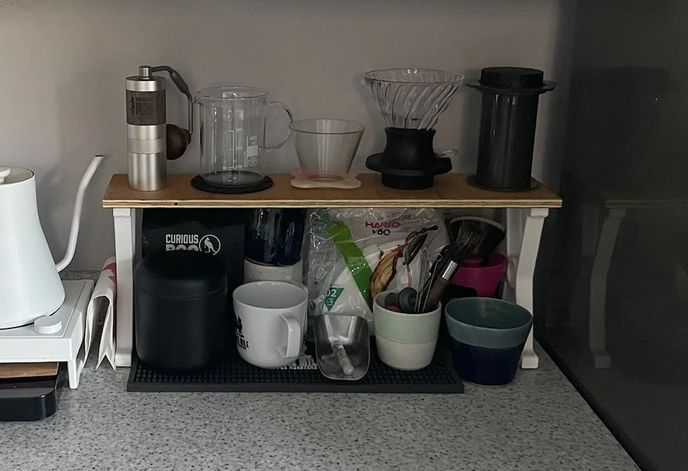 Kệ nhỏ này để mấy món phụ kiện pha cà phê của mình, gồm 2 chân in 3D và một tấm ván plywood. Mình dán thêm miếng chân cao su tự dính ở phía dưới để kệ không bị lắc hay trượt.