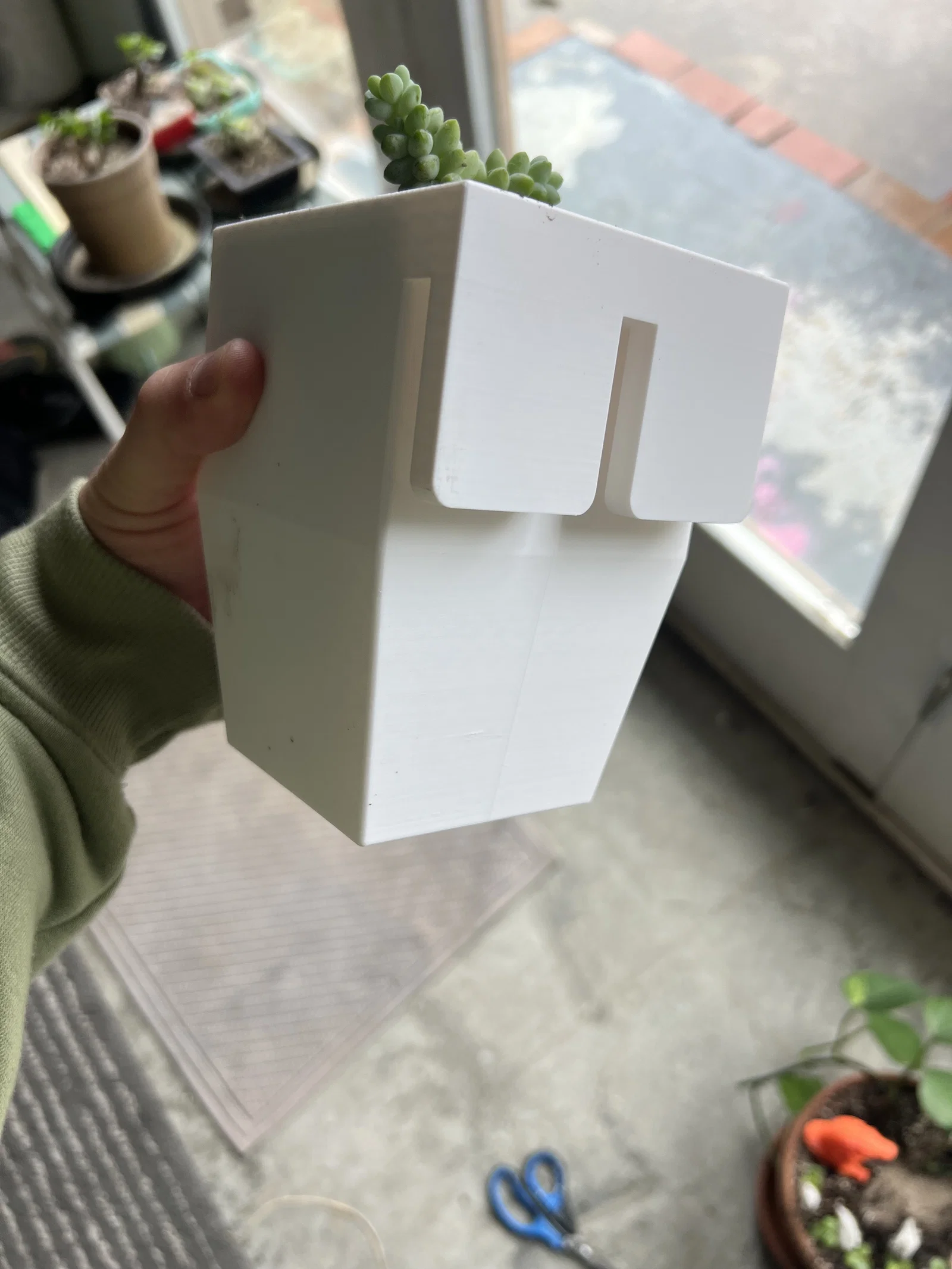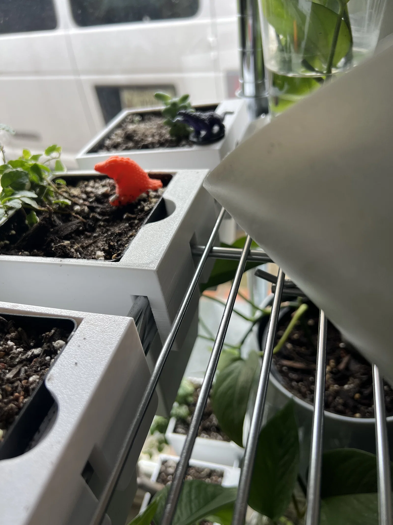 Giá treo chậu nhỏ để móc lên kệ dây (wire shelving), dùng chậu vuông 3.3 inch. In theo mặt open face nên không cần support. Hợp với nhiều loại kệ dây, chỉ khác độ ôm chặt.