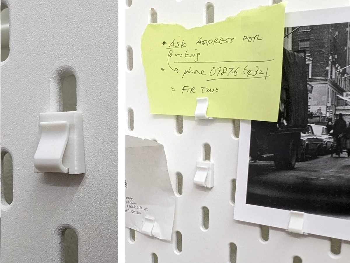 Kẹp giữ thẻ nhỏ cho IKEA Skadis, fit khít 1 lỗ. Giữ được giấy mỏng như receipt, post-it, postcard, danh thiếp, ảnh hoặc lá bài; đã test bìa carton tới 2mm. In 2 phần, bấm clip vào đến khi nghe “click”.