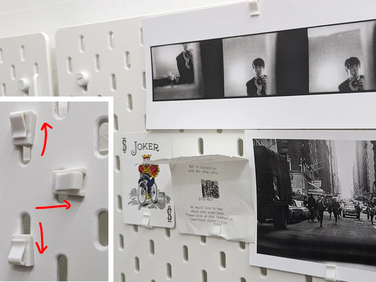 Kẹp giữ thẻ nhỏ cho bảng IKEA Skadis. Fit khít cho 1 lỗ. Kẹp và giữ được giấy rất mỏng (hóa đơn/receipt), post-it, bưu thiếp/postcard, danh thiếp, ảnh, lá bài… - Đã test với bìa carton dày tới 2mm. Có thể xoay theo mọi hướng - có thể kẹp thẻ lộn ngược hoặc kẹp ngang.