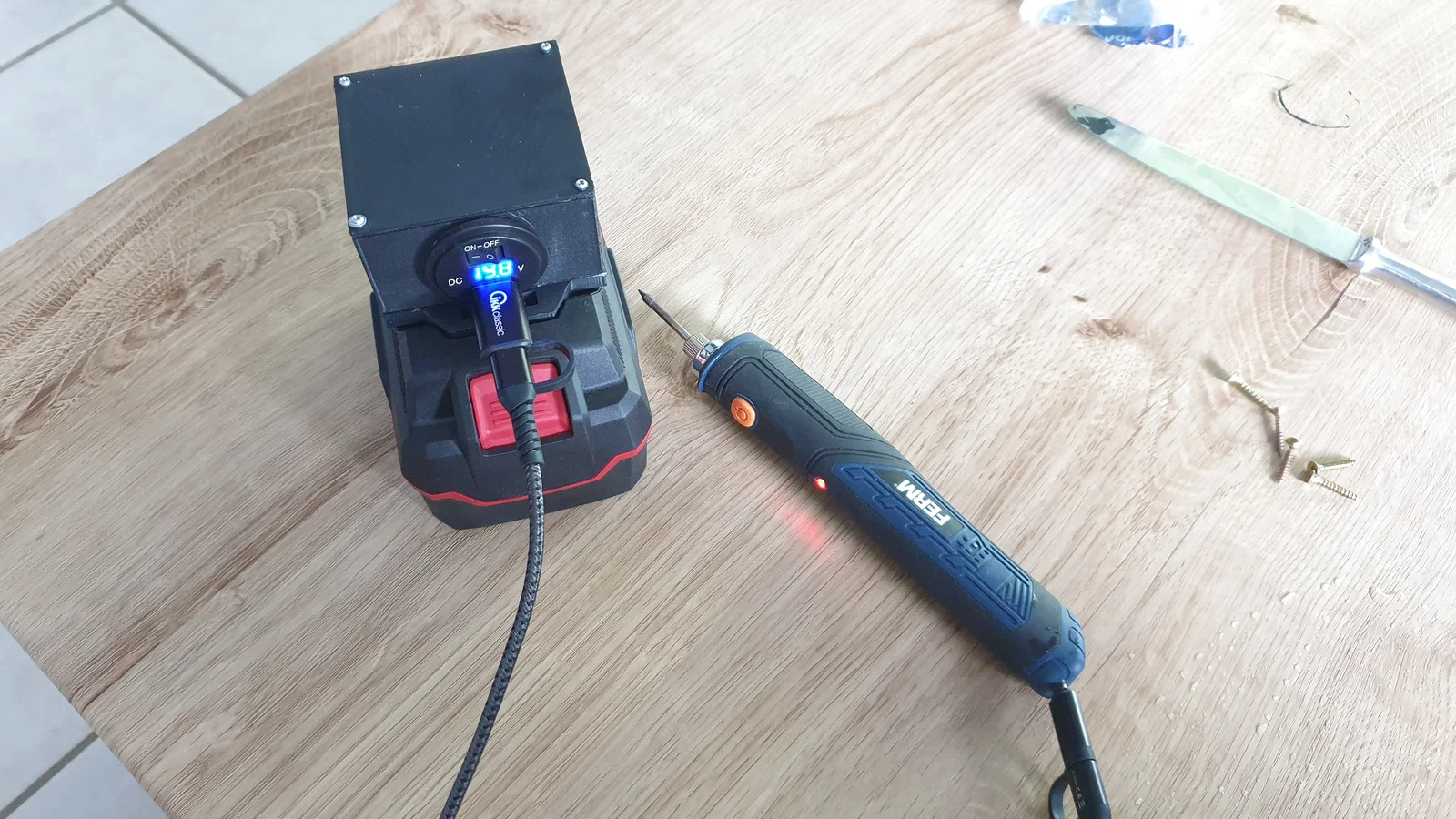 Adapter biến pin Parkside X20V thành powerbank/nguồn USB. Thiết kế đầu tay, đã in và lắp thử. Cần 8 vít tự ăn vào filament, cos dẹt và USB adapter 12V/24V; không cần thêm step-down vì adapter đã có sẵn.