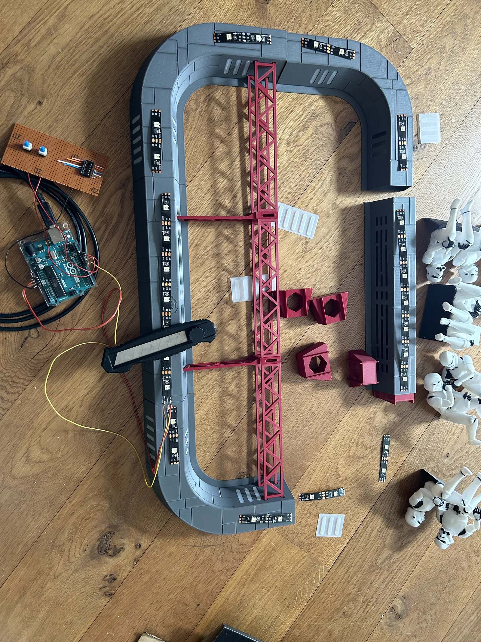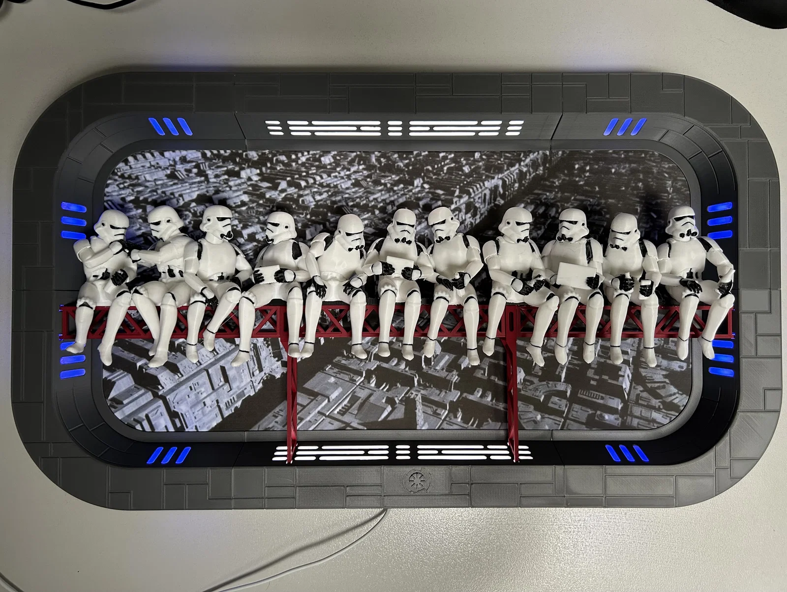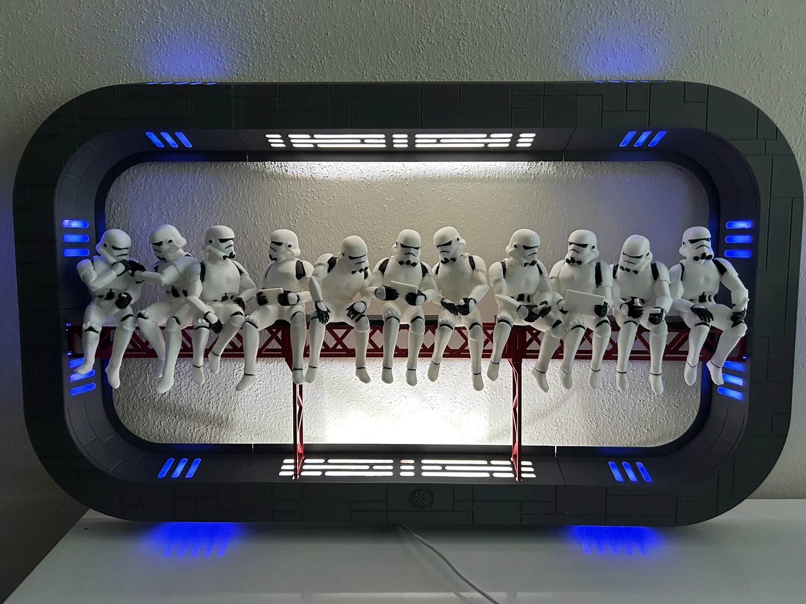 Bộ model modular làm diorama treo tường hoặc picture frame cho Star Wars Troopers (cao ~120mm). In 0,15mm bằng PLA xám đậm/đỏ rượu vang/PLA trong; có chỗ gắn LED stripes và pin, ráp cắm không cần sơn.