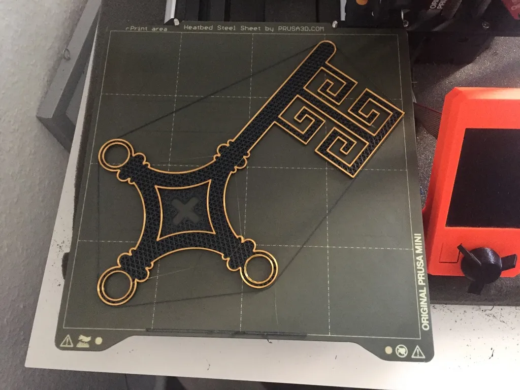 Druck den Schlüssel und den Ständer. Beim Schlüsel empfehle 0.1mm Layer oder zumindest eine variierende Schichtdicke (0.25 zu beginn und 0.07 zum Schluss) So spart man Zeit und hat trotzdem eine gute Auflösung, vor allem die Kugeln am Schlüssel sehen mit 0.2 mm Schichtdicke nicht besonders gut aus. Ich hab es selber auch variierend gedruckt. Da man den Ständer sowieso kaum wahrnimmt kann man den beliebig drucken, ich hab 0.25 mm Schichten genommen