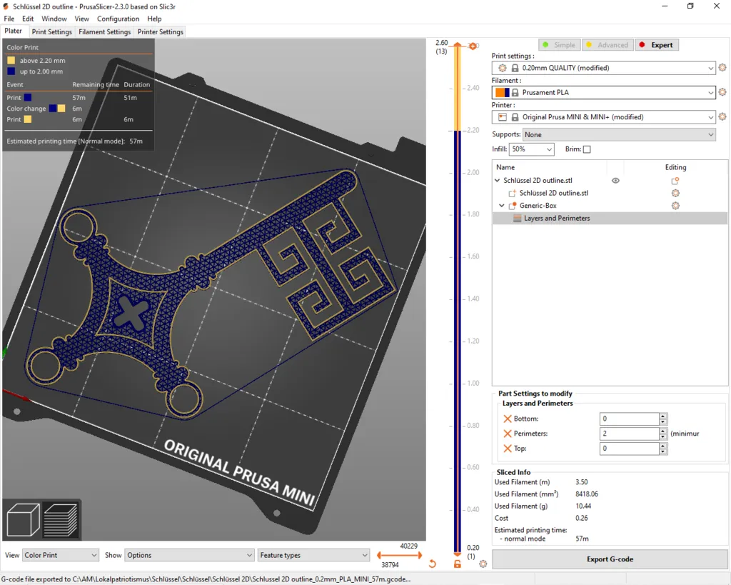 Es gibt zwei unterschiedliche 2D Versionen, zum einen, "2D Schlüssel mit Outline" (siehe Bilder) damit man eine anders farbige Umrandung oben drauf drucken kann. Falls man das nicht möchte gibt es die Version "ohne Outline". Ich habe zusätzlich die Bottom und Top Layer weggelassen um den Infill sichtbar zu drucken, was noch mal einen besonderen Effekt gibt. In der .3mf Sclic3r Datei ist der Farbwechsel bereits eingefügt.