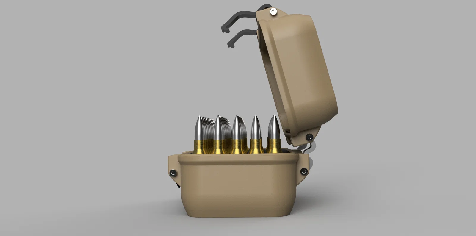 Mẫu hộp đạn (ammo box) dành cho .308W CZ, thiết kế theo yêu cầu với khoảng cách 50 viên/12,60x72,50mm giữa khay insert trên và dưới. Chưa in thử; cần 8 con ốc M3x20mm cho latch và hinge.