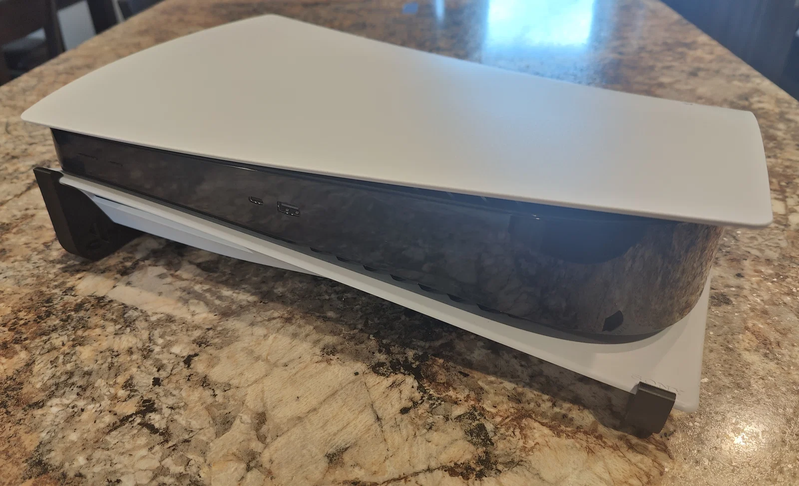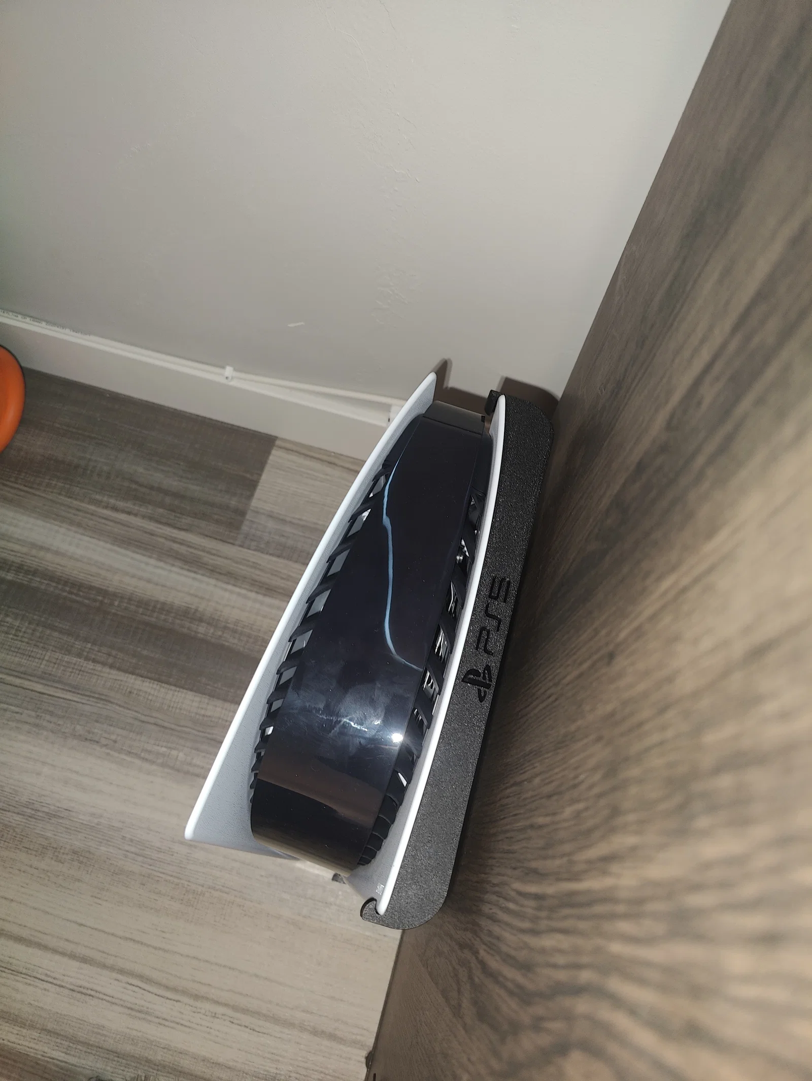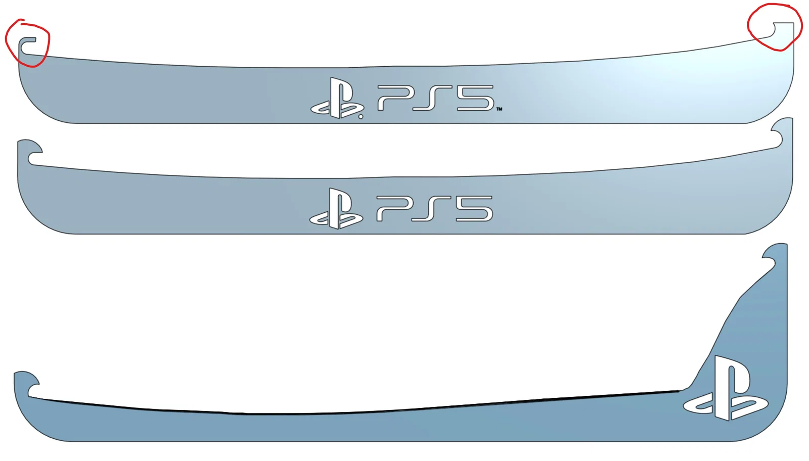 Chân đế ngang cho Playstation 5 bản đĩa, có logo. Đã gia cố chân trái: ngàm khớp giống chân phải, bám chắc hơn và cứng hơn. Loại bỏ chữ quá nhỏ khó in, và xoay model để mặt đẹp nằm trên build plate.