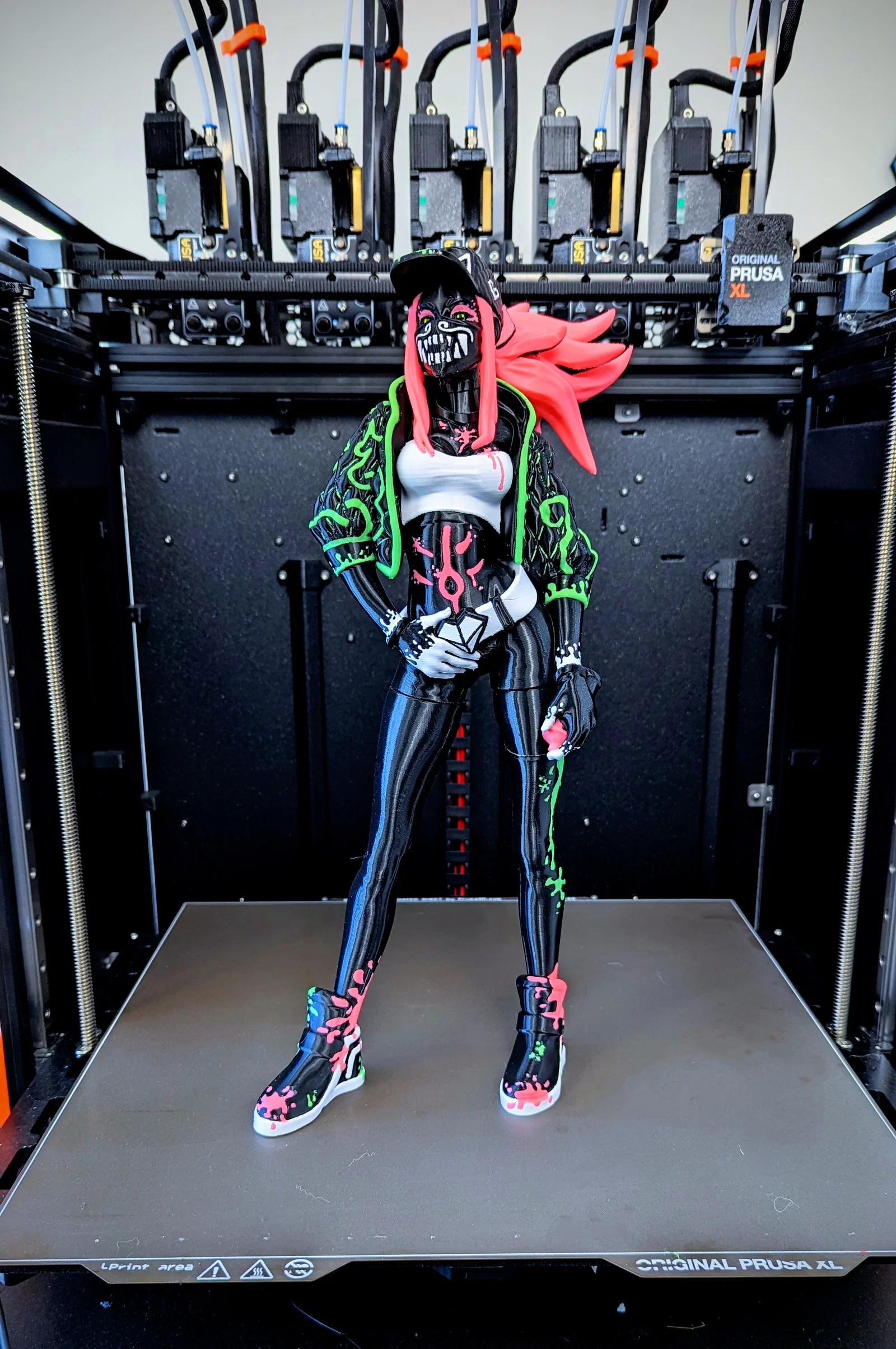 Bản remix Akali K/DA dành cho in multicolour, có lựa chọn 5 màu hoặc 3 màu. Model được tách 3 mảnh để dễ in; pegs nằm trong file .3mf và có thể cần scale nhẹ theo dung sai từng máy. In thử và kiểm tra trong slicer trước khi in.