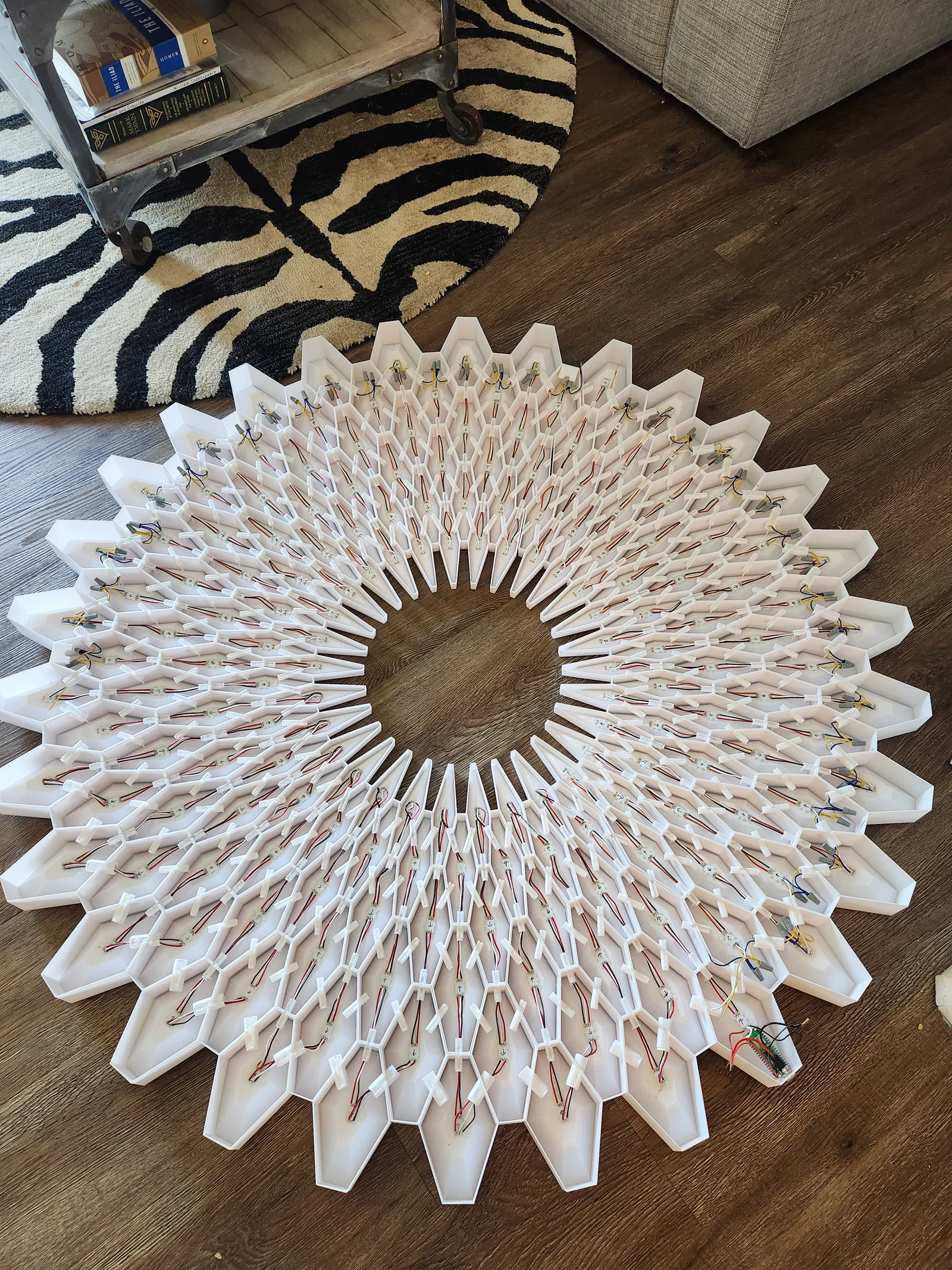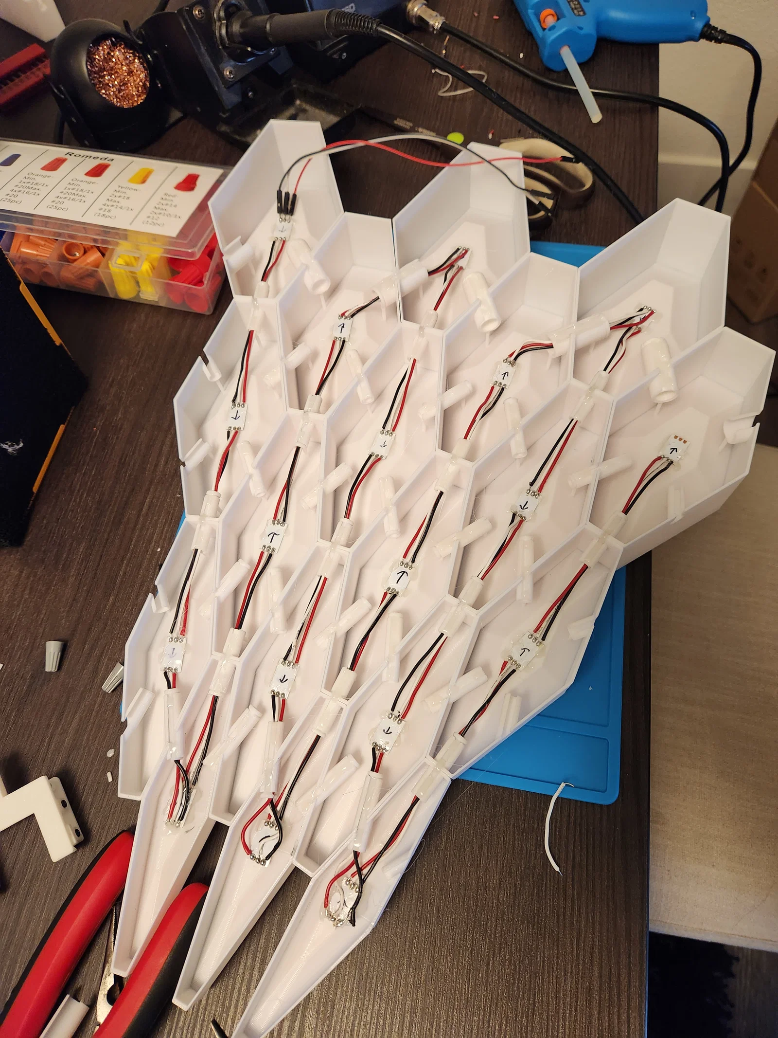 Bộ lắp đặt này dùng hơn 6kg chi tiết và connector đã in, và gồm 180 LED individually-addressable. Mình dùng vài mét dây để nối các LED Neopixel vào một Raspberry Pi Pico W, chạy một MicroPython webserver đơn giản để nhận lệnh (mình có nối với HomeAssistant để chạy automation).