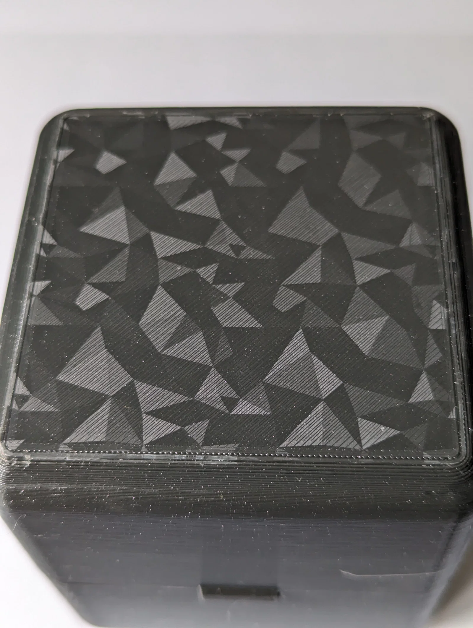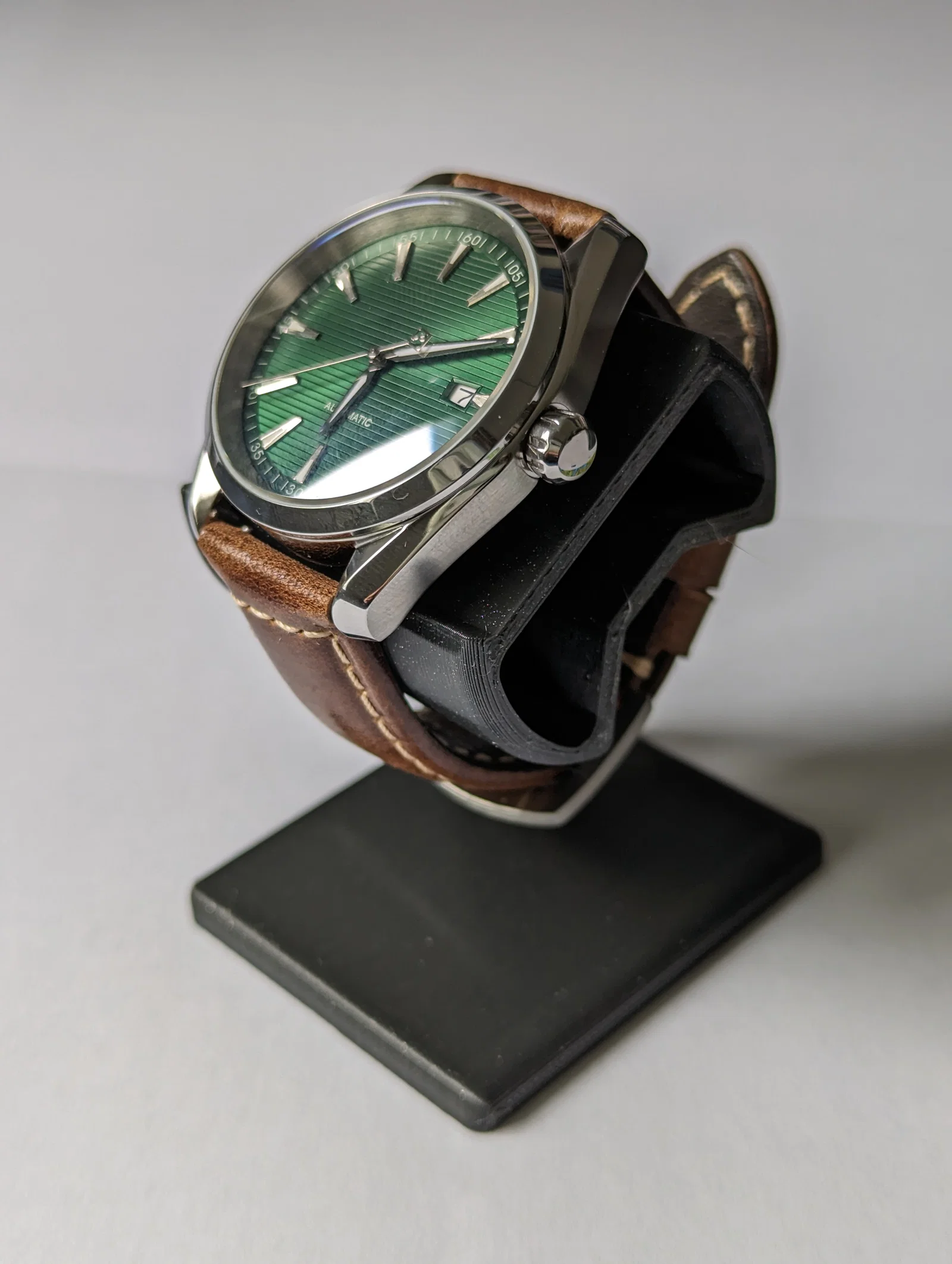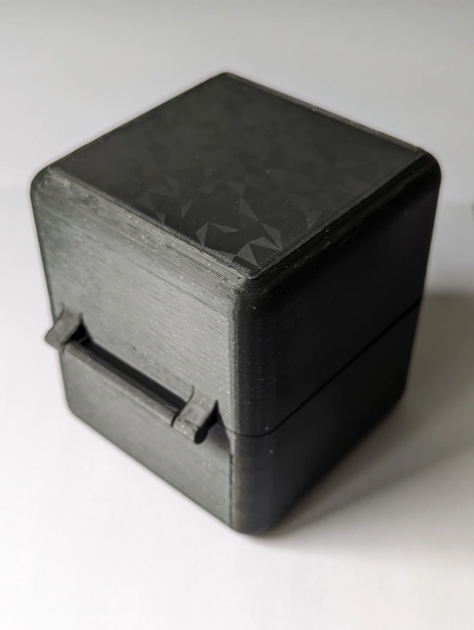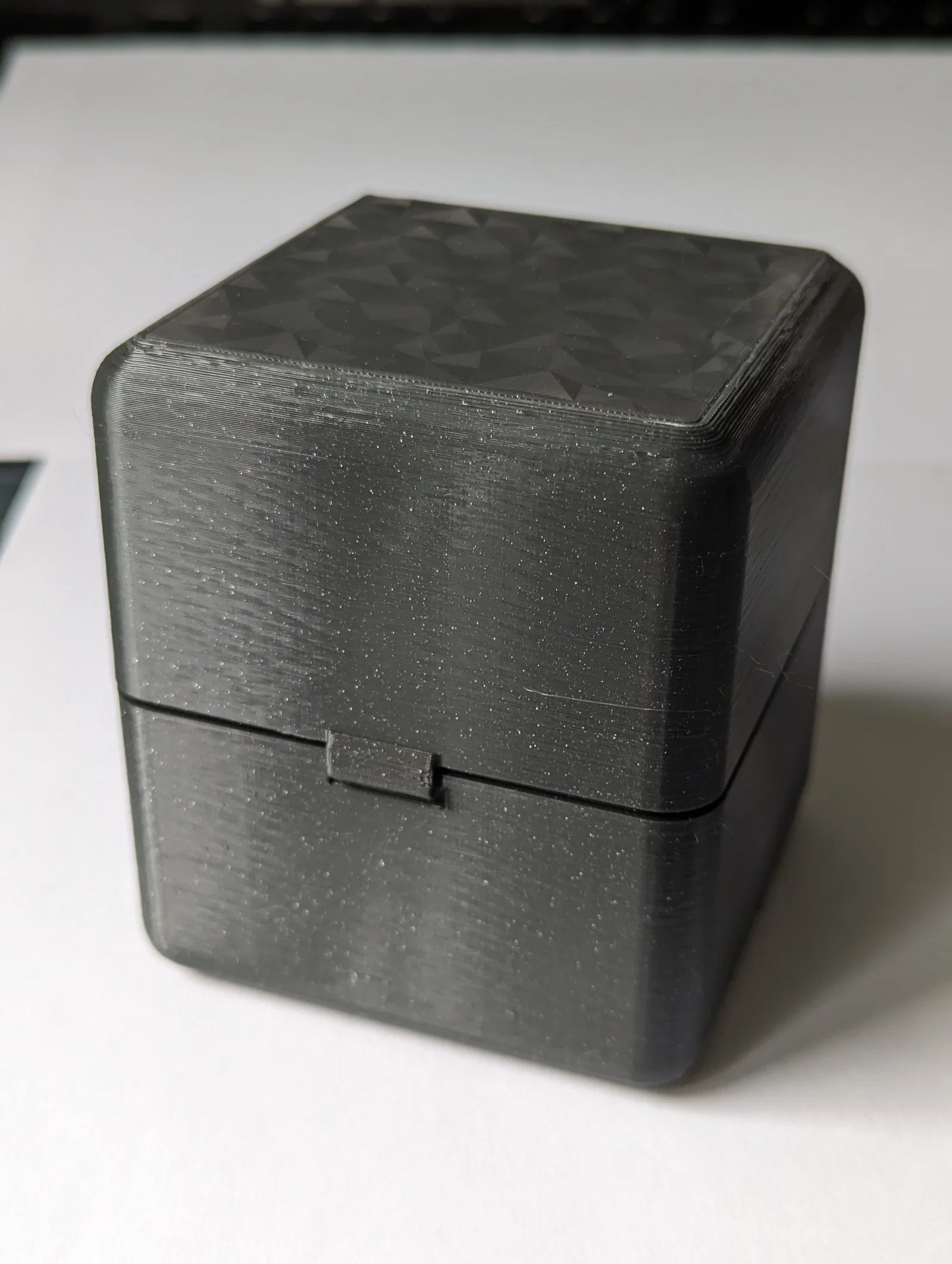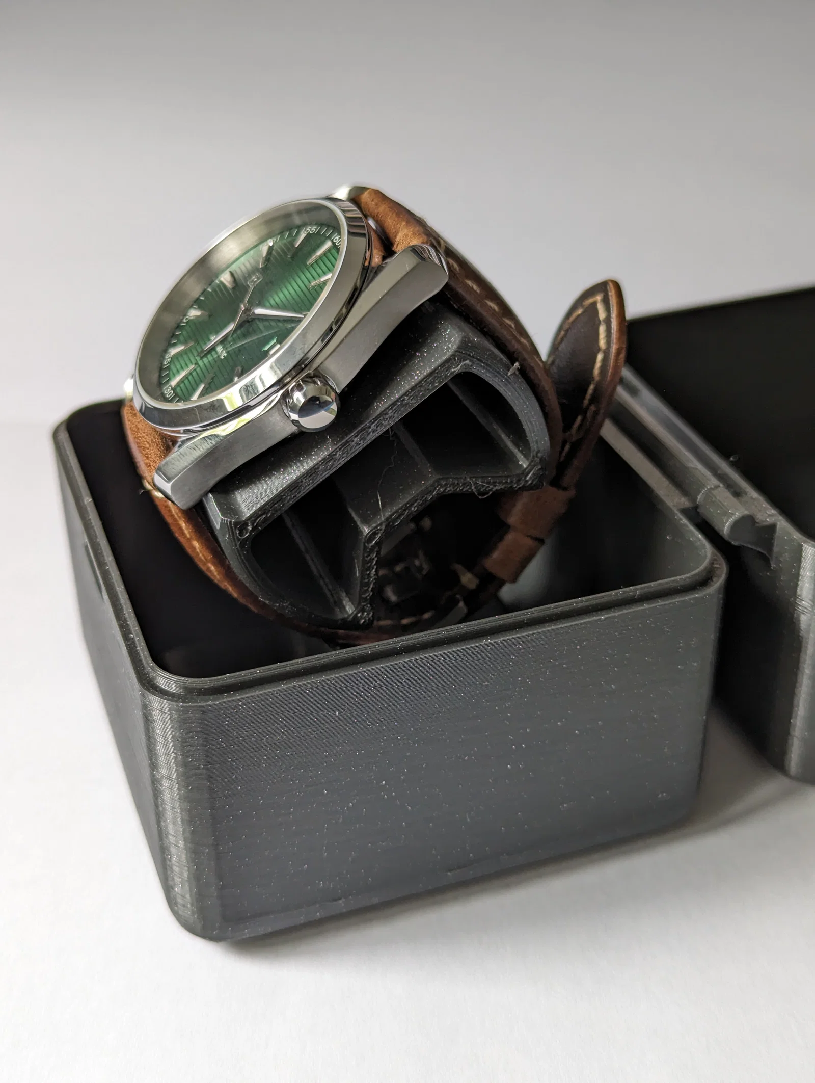 Mẫu Watch gift box gồm 2 phần: hộp và giá đỡ. Bạn có thể in riêng giá đỡ đồng hồ. Hiệu ứng mặt đáy và nắp tạo bằng tấm holographic (diffraction sheets). Hộp in không cần support, lưu ý in phía trong bản lề.