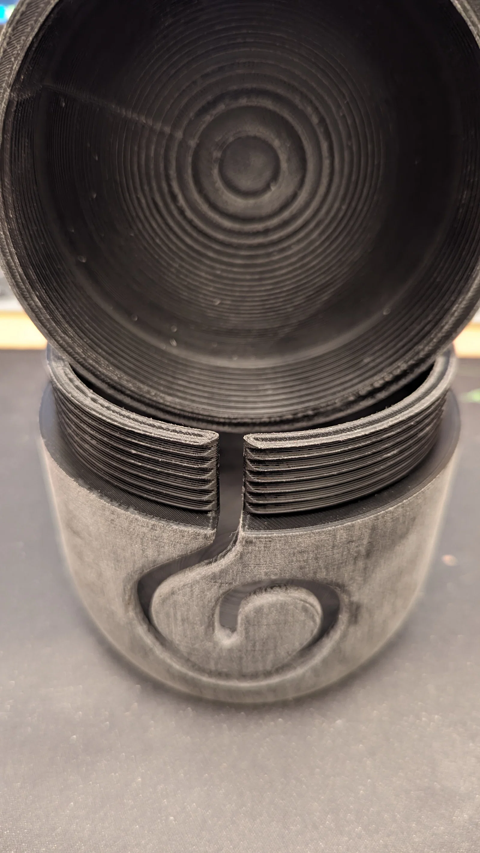 Tô đựng len có nắp đơn giản giúp bảo vệ cuộn len khỏi mèo “thó” và giữ cuộn len đứng yên khi đang làm dự án. Phần rãnh xoắn hơi khó in, nên dùng supports; chà nhám là ổn. Cao tổng 120mm.
