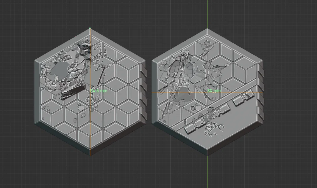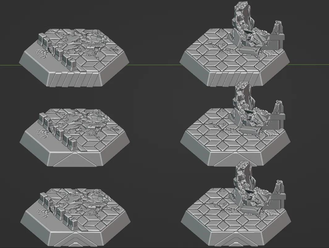Phần 1 của bộ đế (base) hex 30mm với phong cách phế tích đô thị hư hại nặng, kèm tuỳ chọn các kiểu ký hiệu mặt trước (Hazard Stripes, Arrow hoặc Double Arrow). Có 2 mẫu thiết kế khác nhau, mức độ chi tiết cao, và mỗi mẫu đều có tuỳ chọn đáy đặc (solid) hoặc rỗng (hollow).