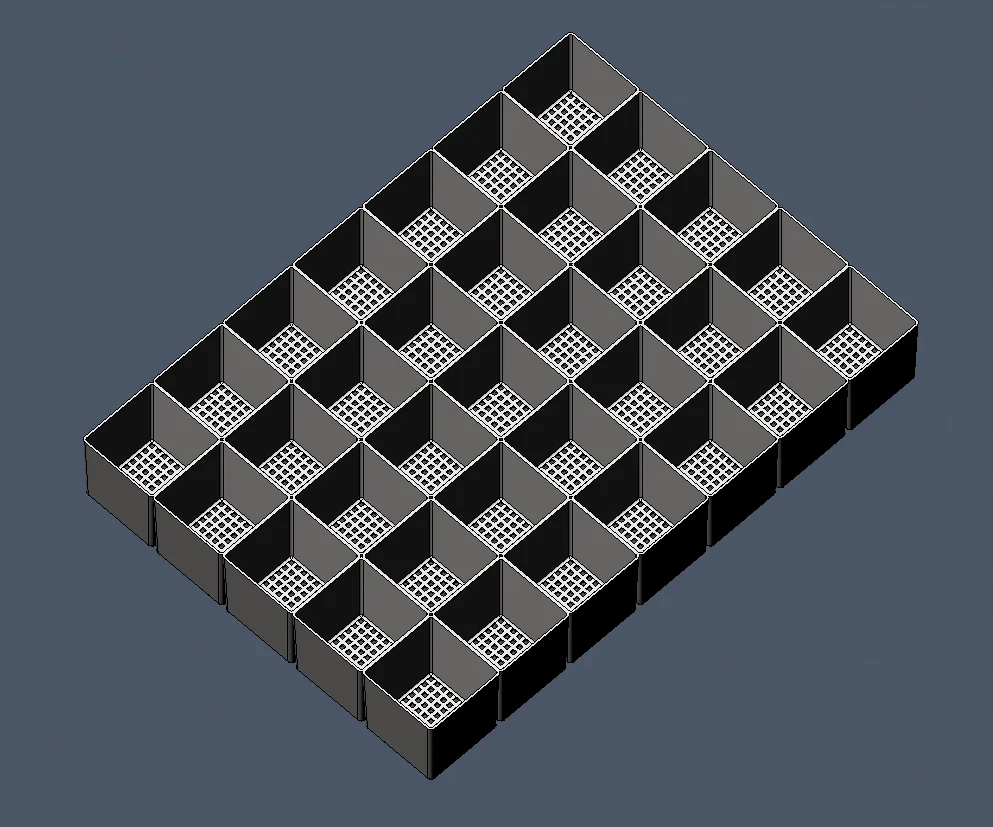 Hệ khay trồng thủy canh dạng xếp chồng dùng cho trồng rau/thảo mộc. Nước từ khay trên chảy xuống khay dưới và xả phần nước sâu hơn 5mm. Kích thước khay 200×280×40mm, bố cục 5×7 ô 40mm.