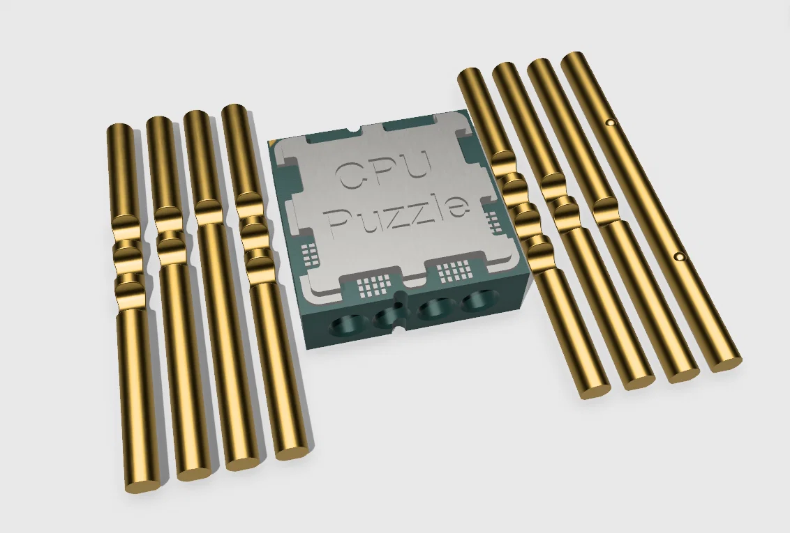 Bản remix mẫu CPU Puzzle của mình (2022): làm lại mặt trên kiểu CPU AMD, nới lỗ và canh thẳng hàng để peg trượt mượt và có thể tự rơi ra tăng độ khó. Không cần supports; nên in 0.16mm hoặc mịn hơn.