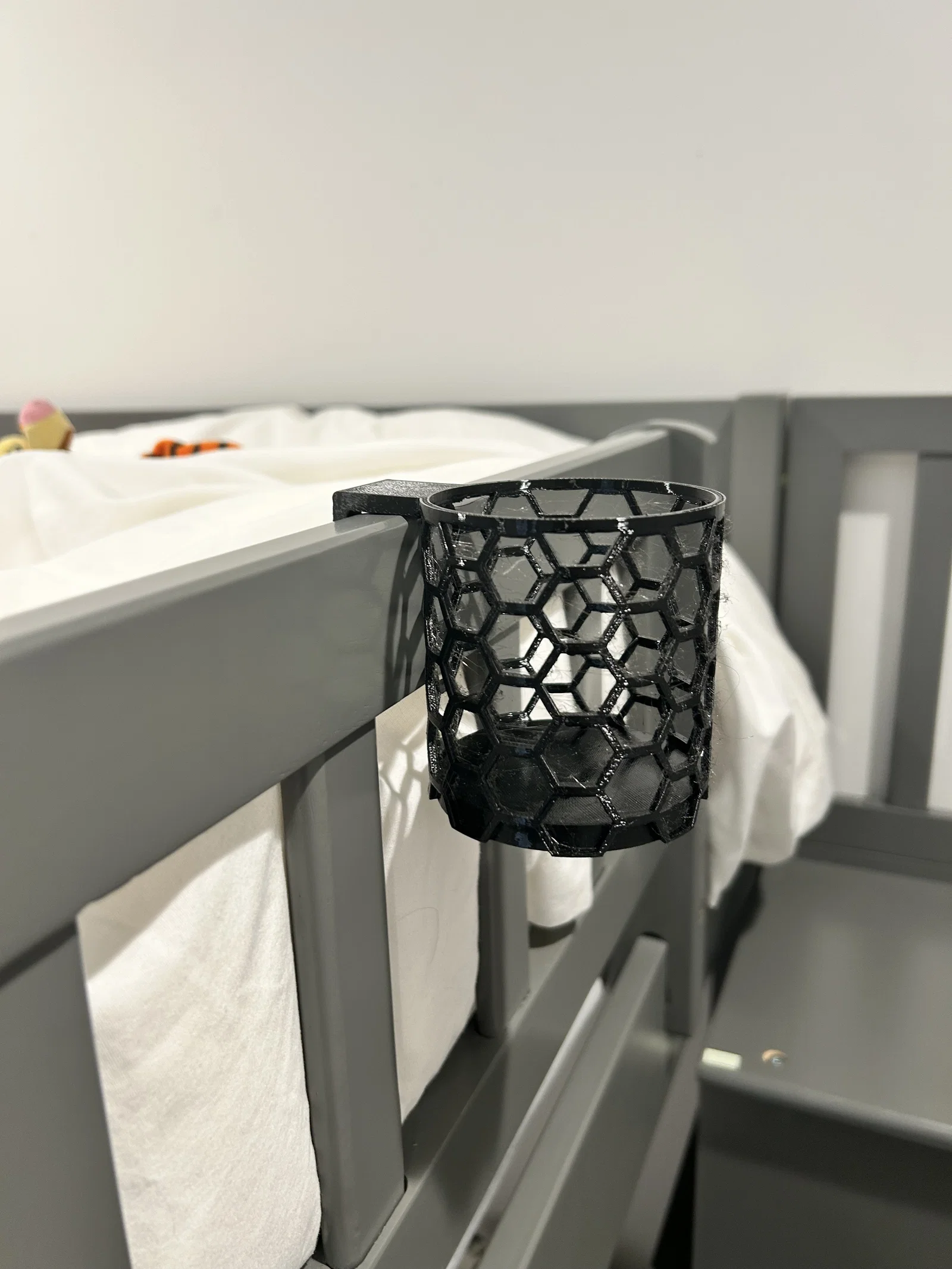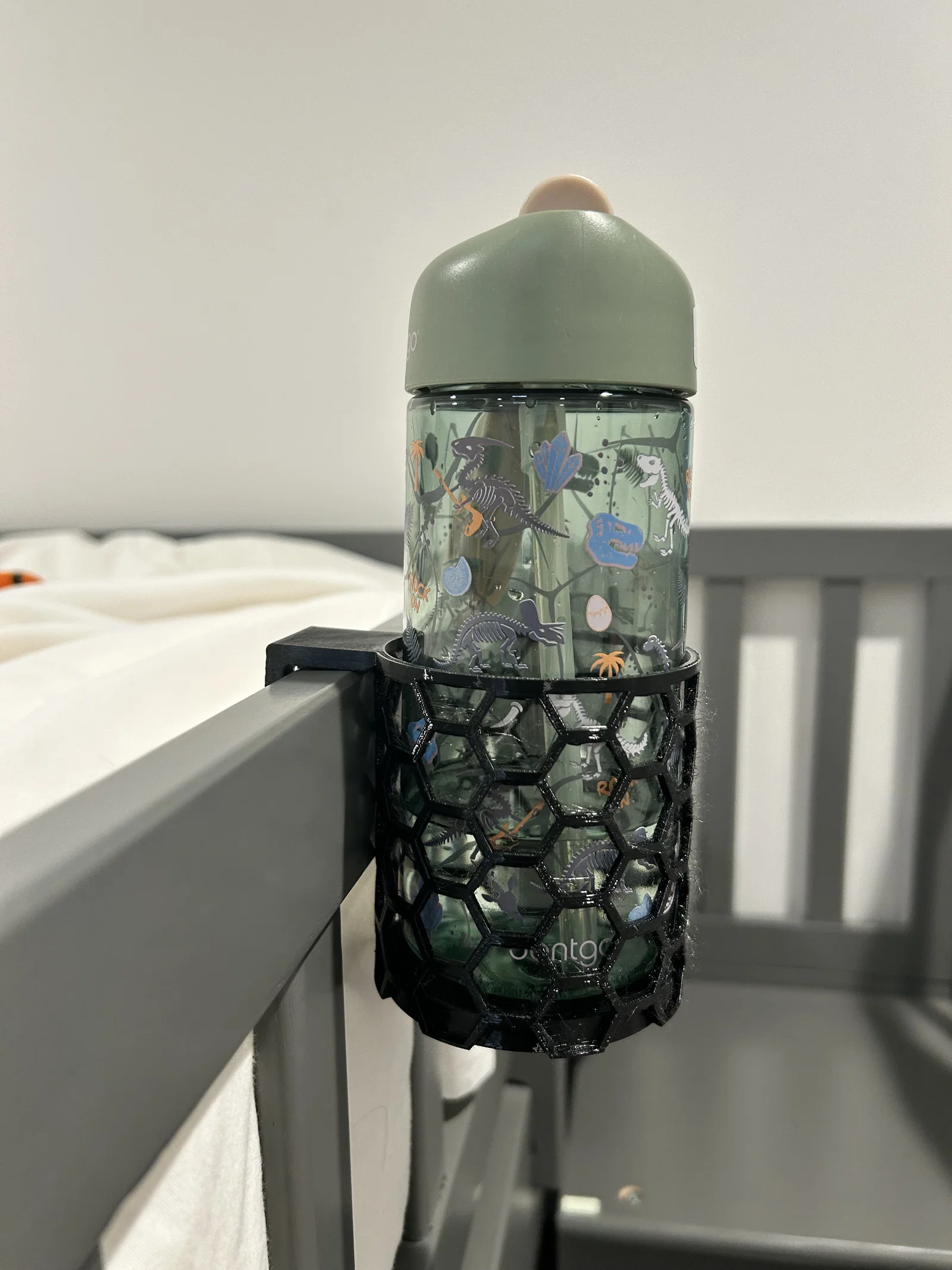 Giá đỡ ly họa tiết lục giác, đường kính trong 75mm, sâu 85mm. Có 2 phiên bản độ sâu móc: 20mm và 3 inch. Mình in bằng PETG, ra rất chắc, đủ giữ chai đầy.