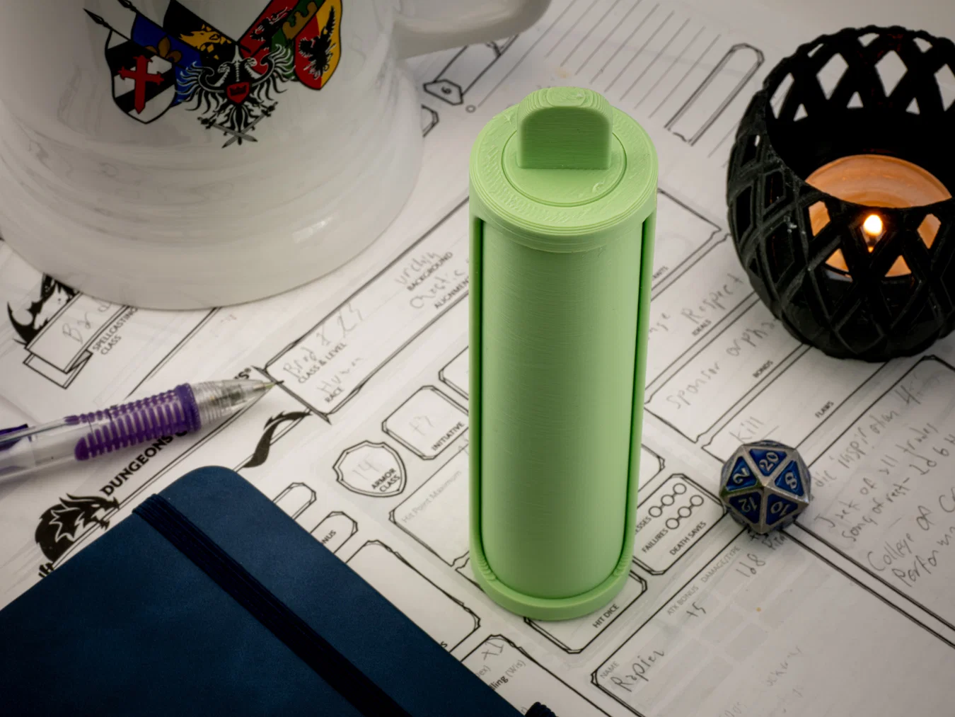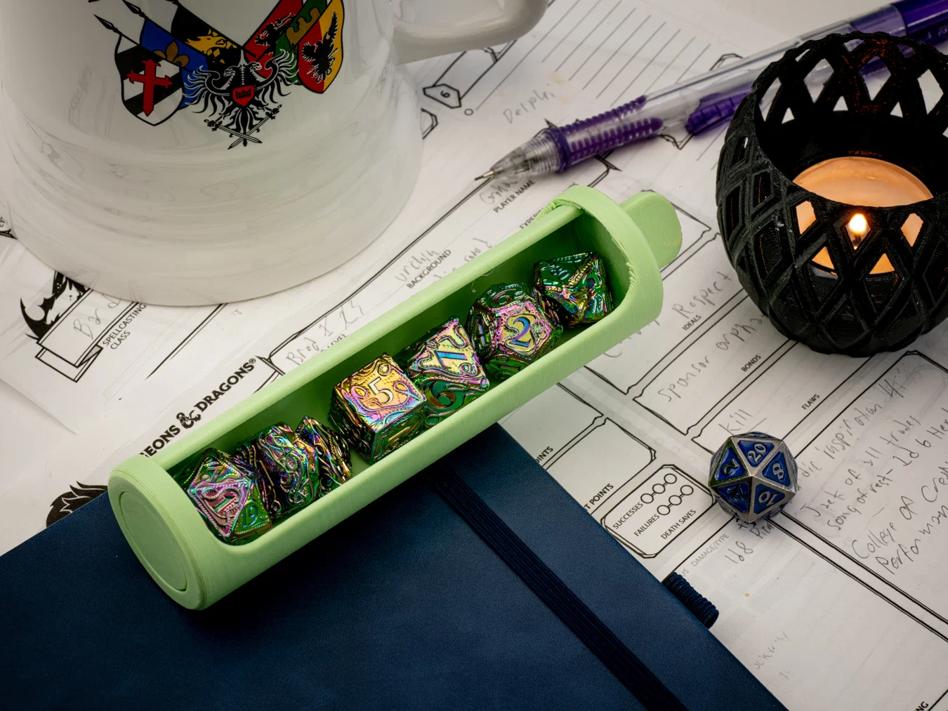 Mẫu Print-in-Place vui nhộn để đựng đủ bộ xúc xắc DND: D2, D4, D6, D8, D10, D12 và D20. Cửa xoay mở/đóng tiện lợi, không có khóa nhưng thường không tự bung nếu không lắc mạnh.