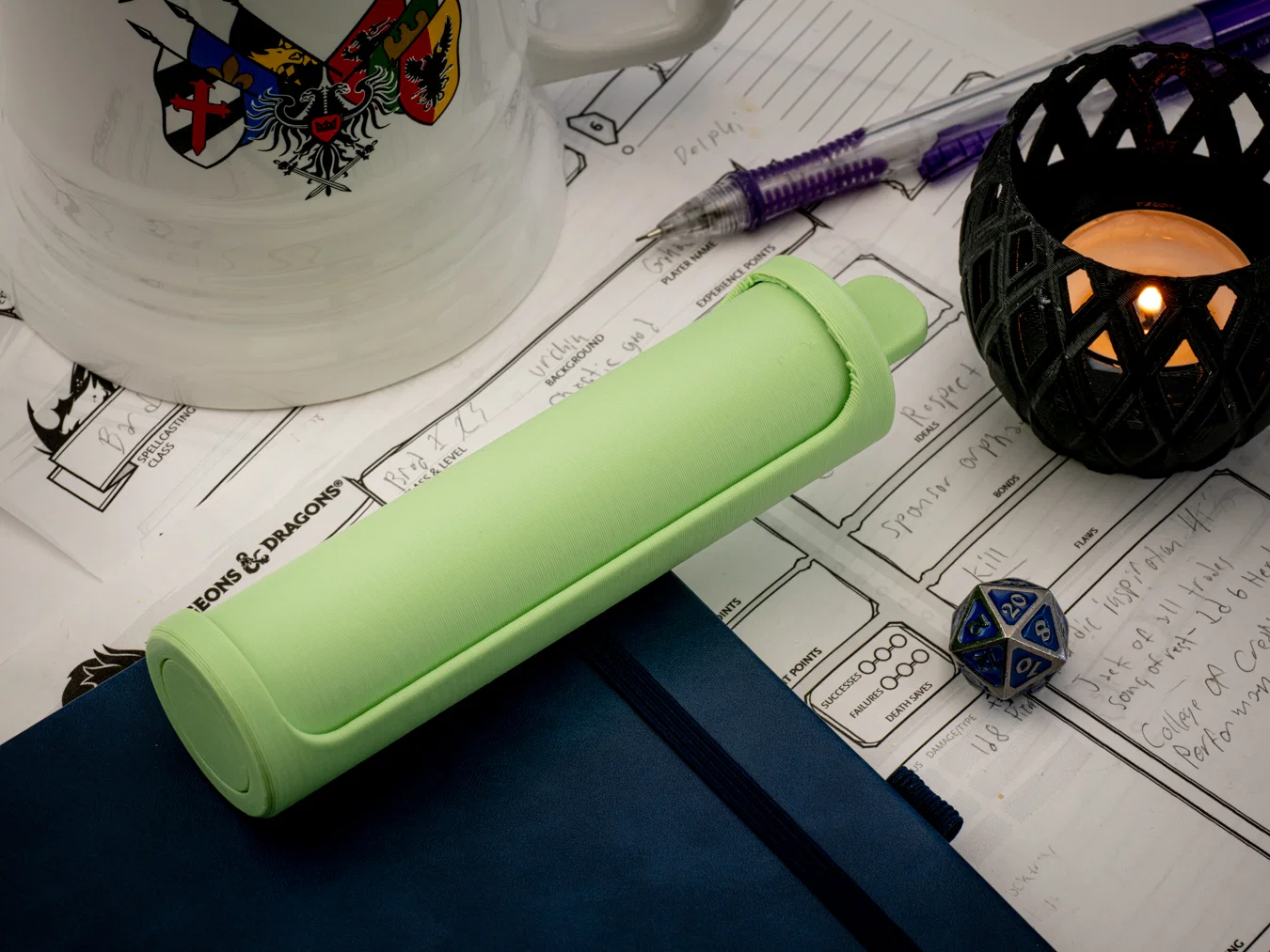 Đây là một hộp đựng xúc xắc mình nghĩ ra, dùng cơ chế Print-in-Place với một “cánh cửa” xoay để mở/đóng. Mẫu này không có cơ chế khóa để giữ cửa đóng chặt, nhưng theo trải nghiệm của mình thì nó cũng không tự bung ra đâu—trừ khi bạn lắc mạnh thiệt mạnh.