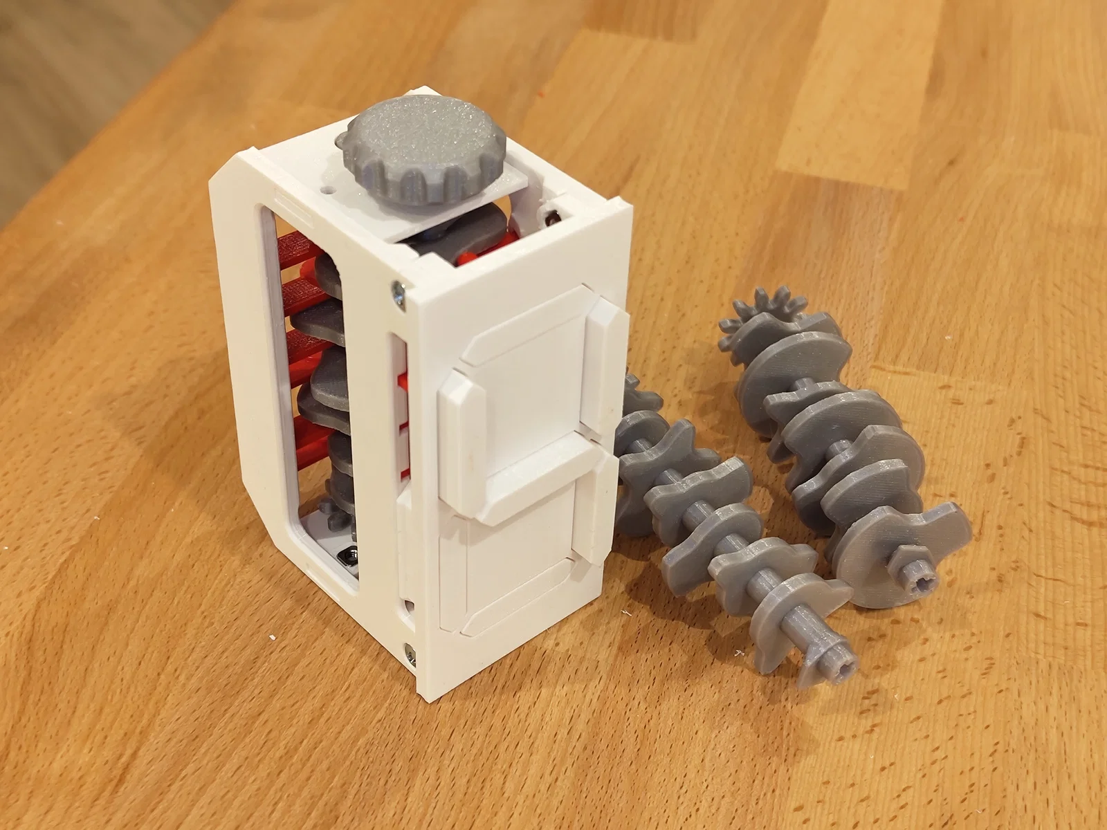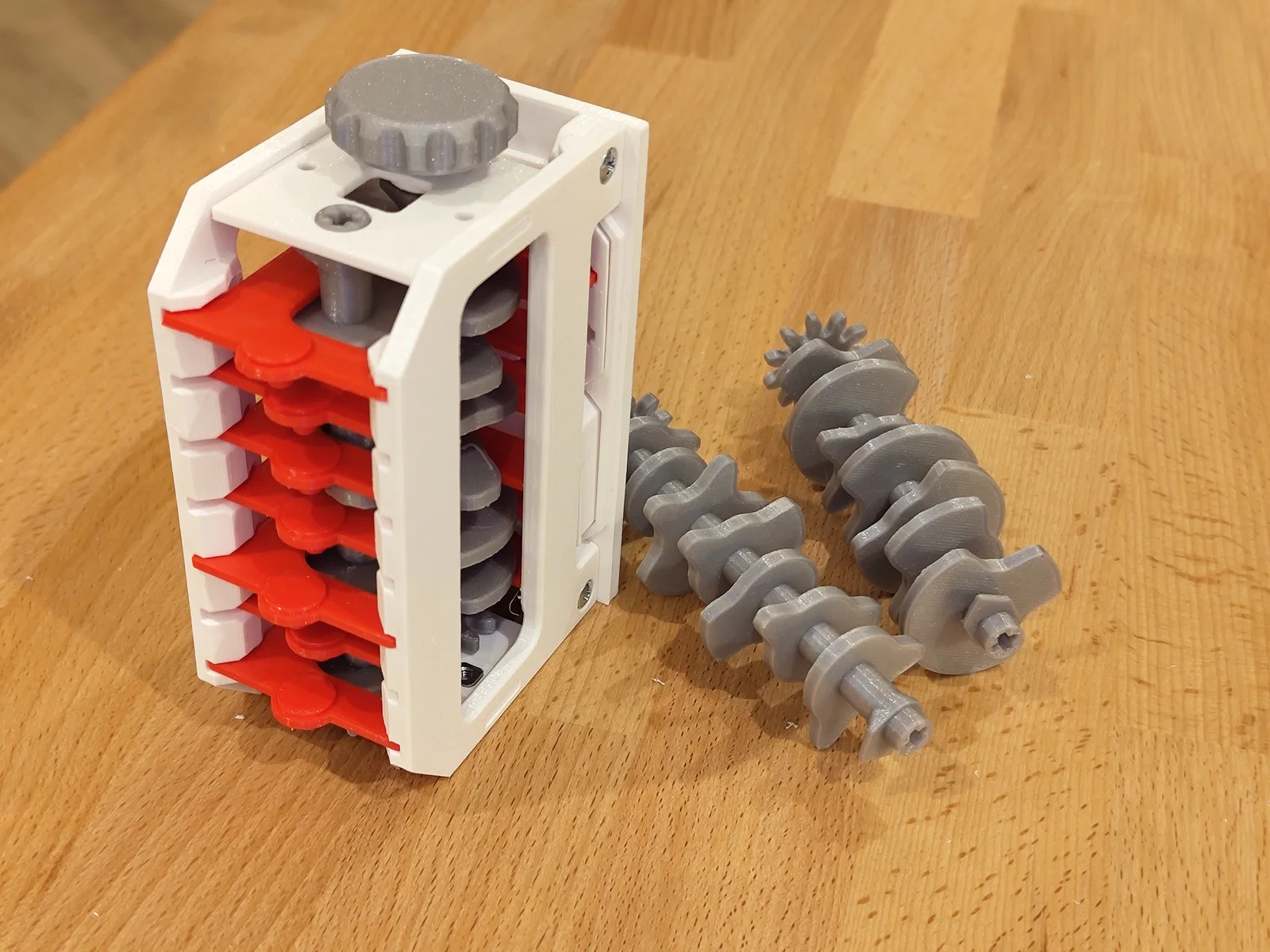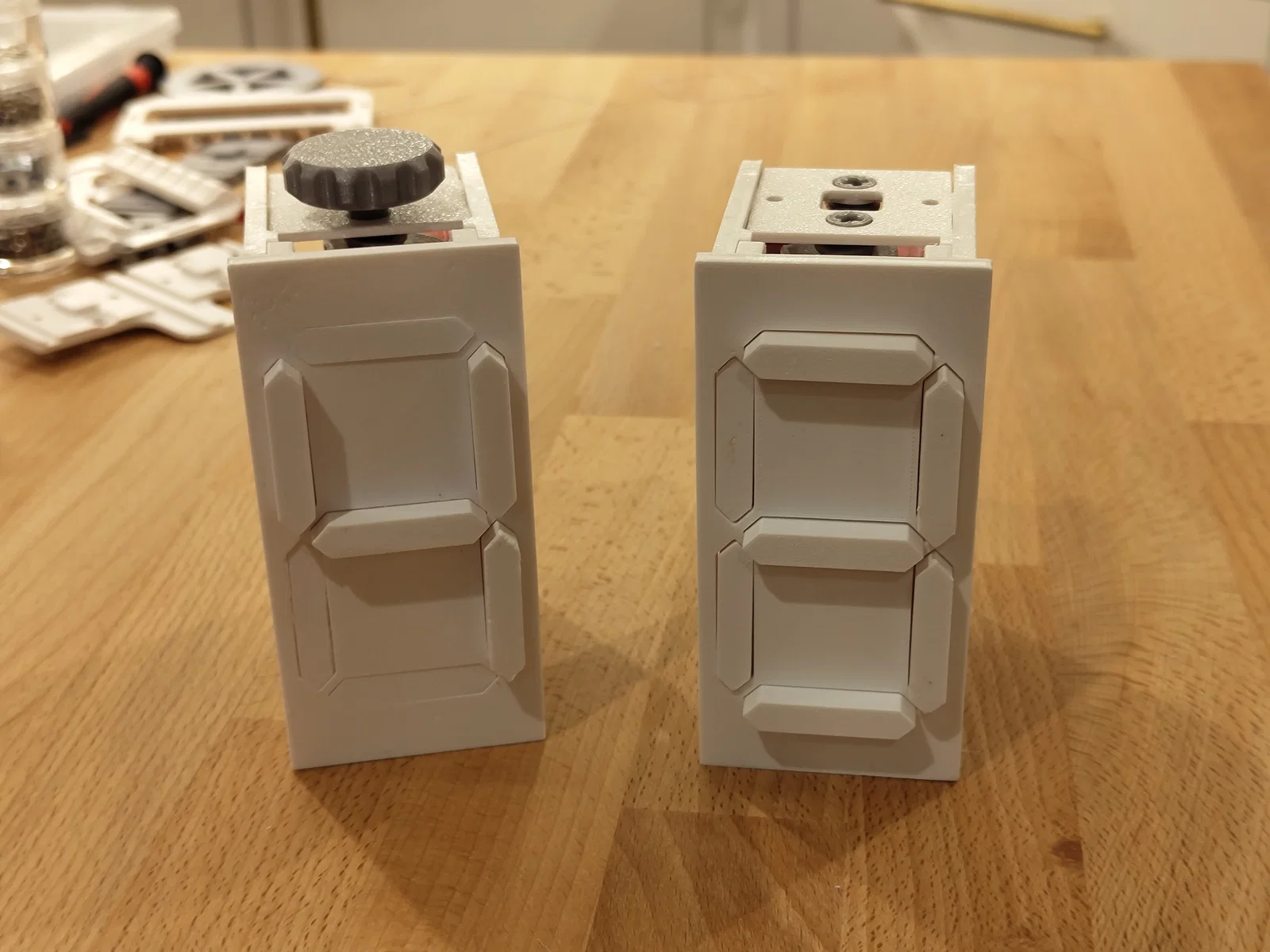 Mô hình Mechanical Seven Segment Display dạng cơ, hiển thị 1 chữ số và đếm từ 0–9 nhờ cơ cấu camshaft. Bản mô tả này dùng cặp camshaft; tác giả khuyến nghị dùng phiên bản mới chỉ 1 camshaft.