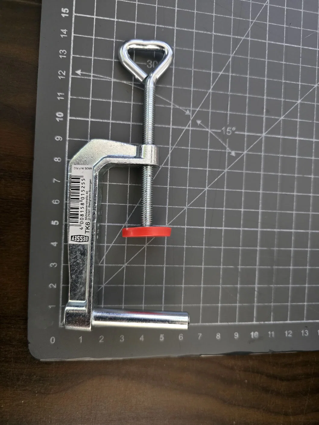 Thiết kế dựa trên kẹp Bessey TK6 ( https://www.amazon.es/dp/B000JLSNAE?psc=1&ref=ppx_yo2ov_dt_b_product_details ), nhưng bất kỳ loại clamp nào có đường kính tối đa 9mm và độ sâu không quá 100mm đều sẽ lắp vừa.