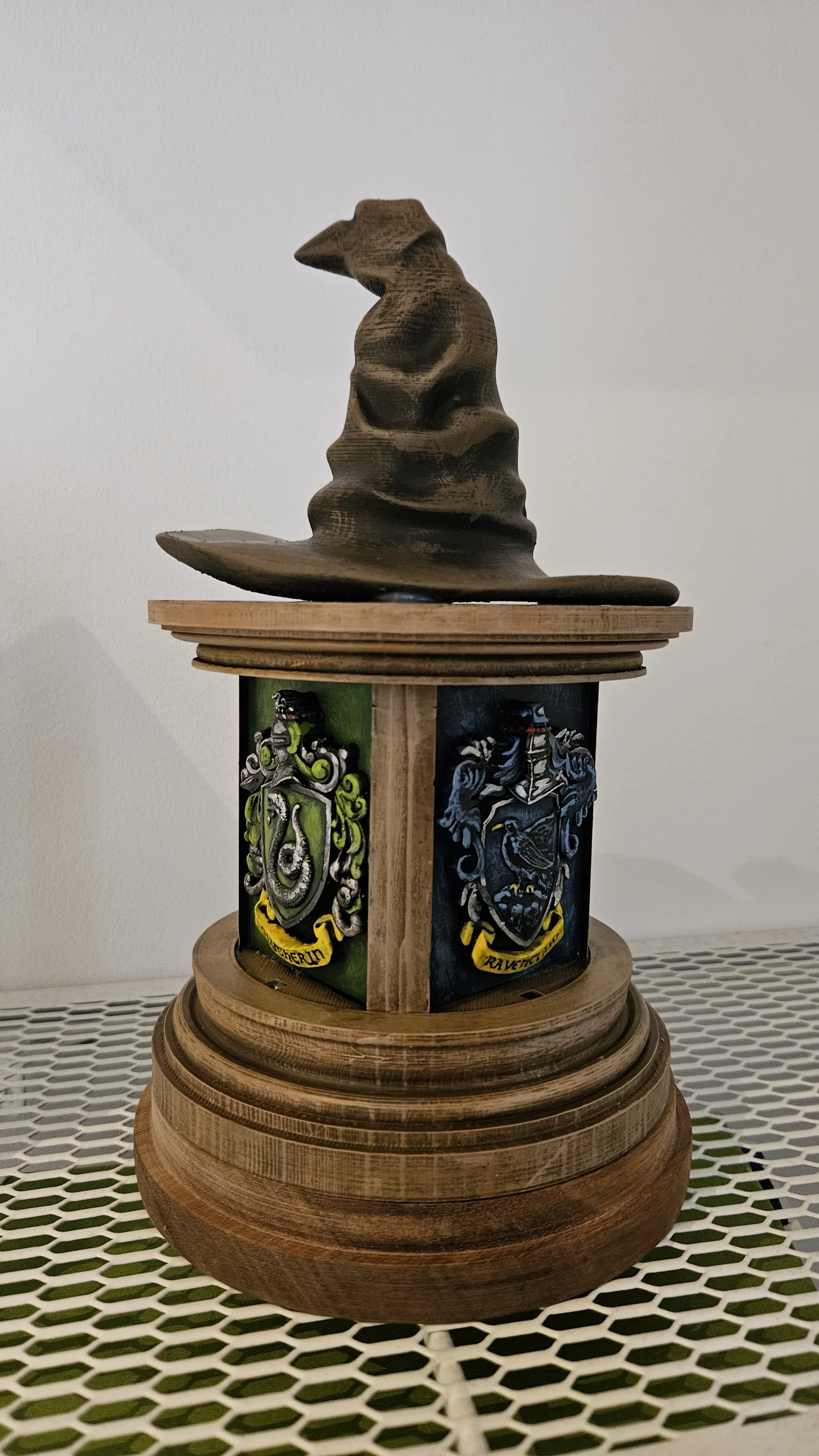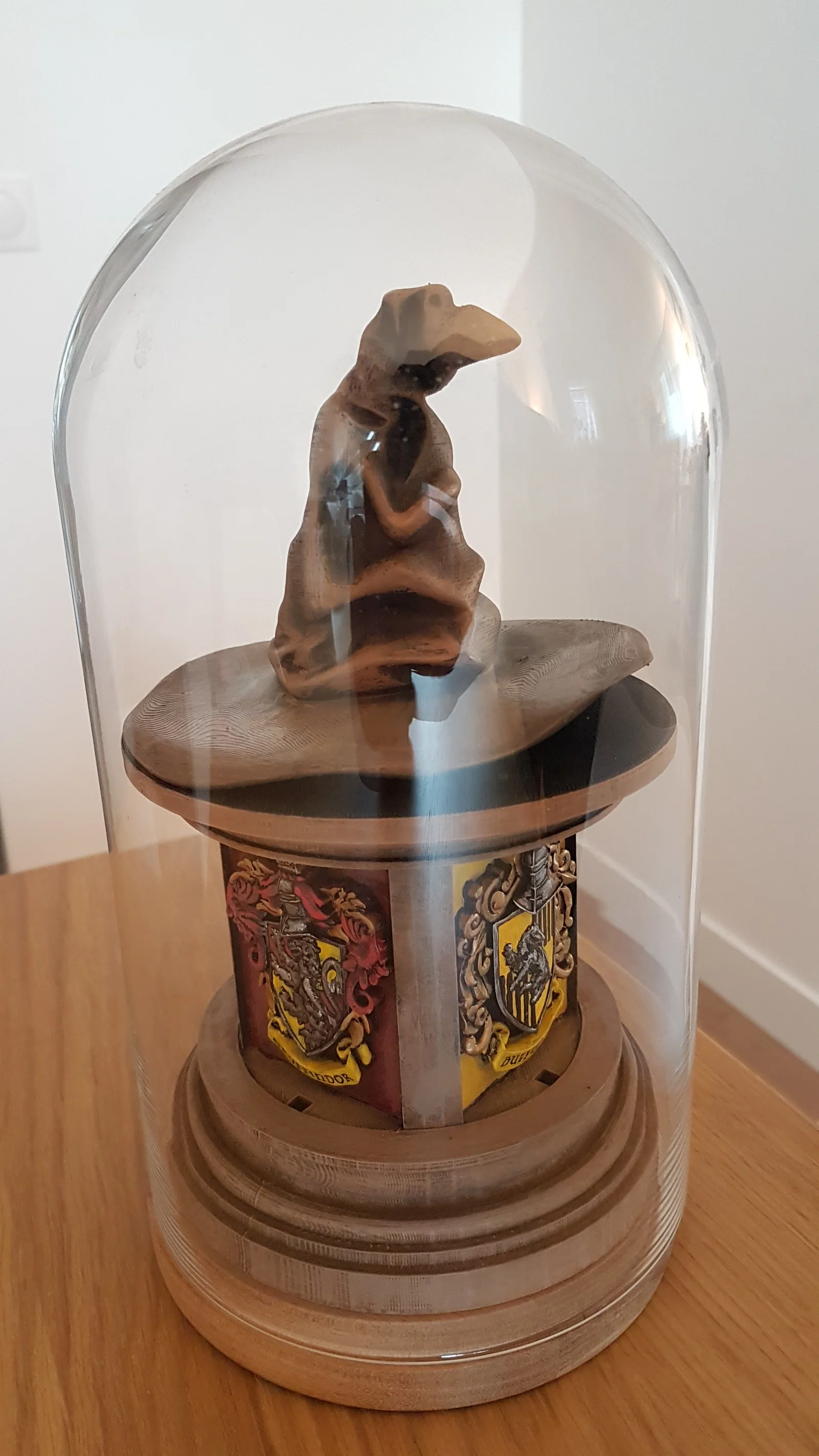 Mô hình trang trí chủ đề các nhà Hogwarts kèm Nón Phân Loại. Phần đế (socle) chừa sẵn chỗ gắn LED và pin 9V, phù hợp trưng bày dưới chuông kính trên đế gỗ cho hiệu ứng đẹp mắt.