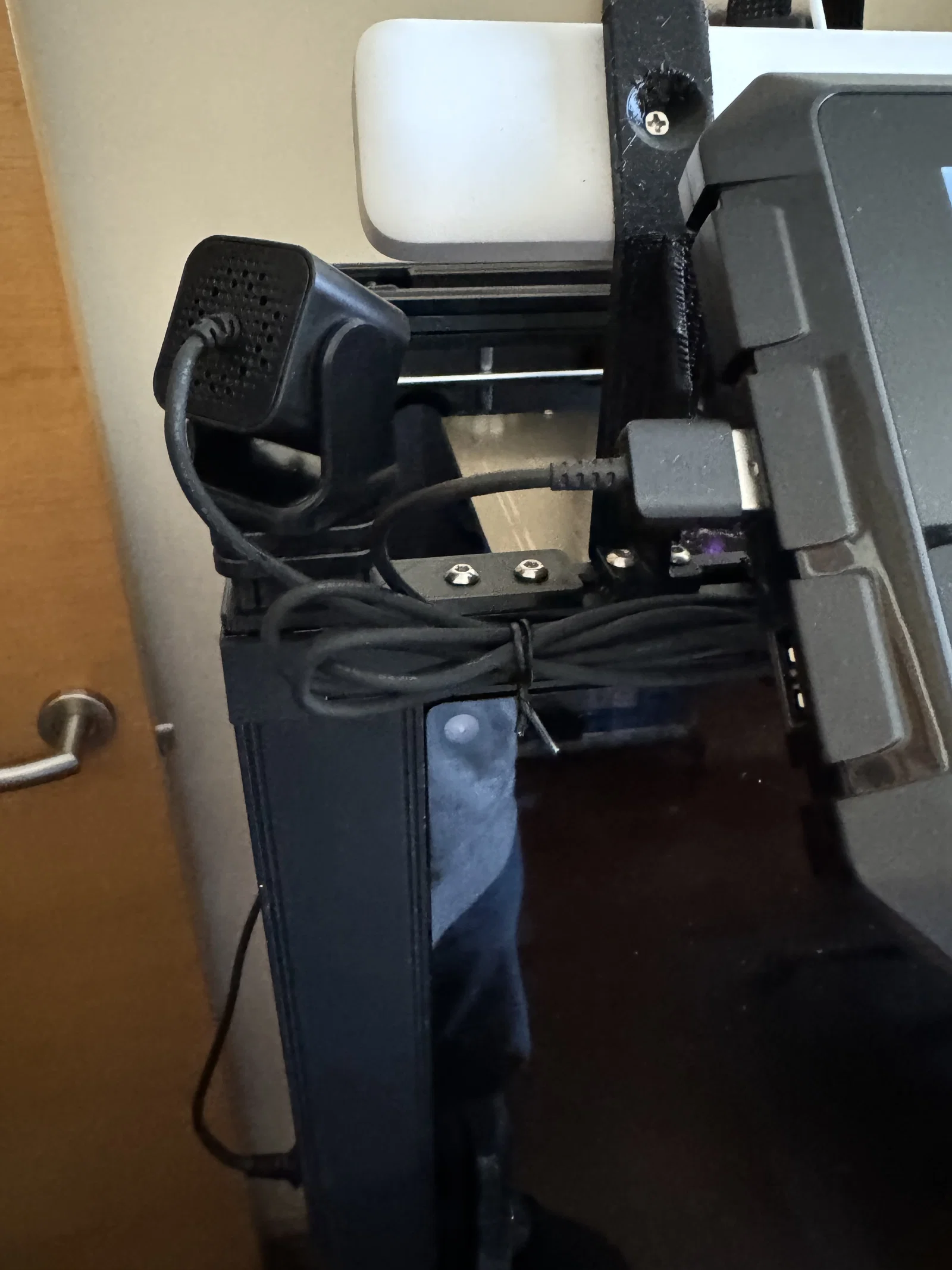 Khi lắp, tháo ngàm camera zin (2 ốc lục giác Allen). Lắp ốc (M4) để bắt vào thanh profile 2040 của máy, rồi gắn camera lên ngàm. Sau đó lắp cả cụm vào góc trước bên trái của máy in.