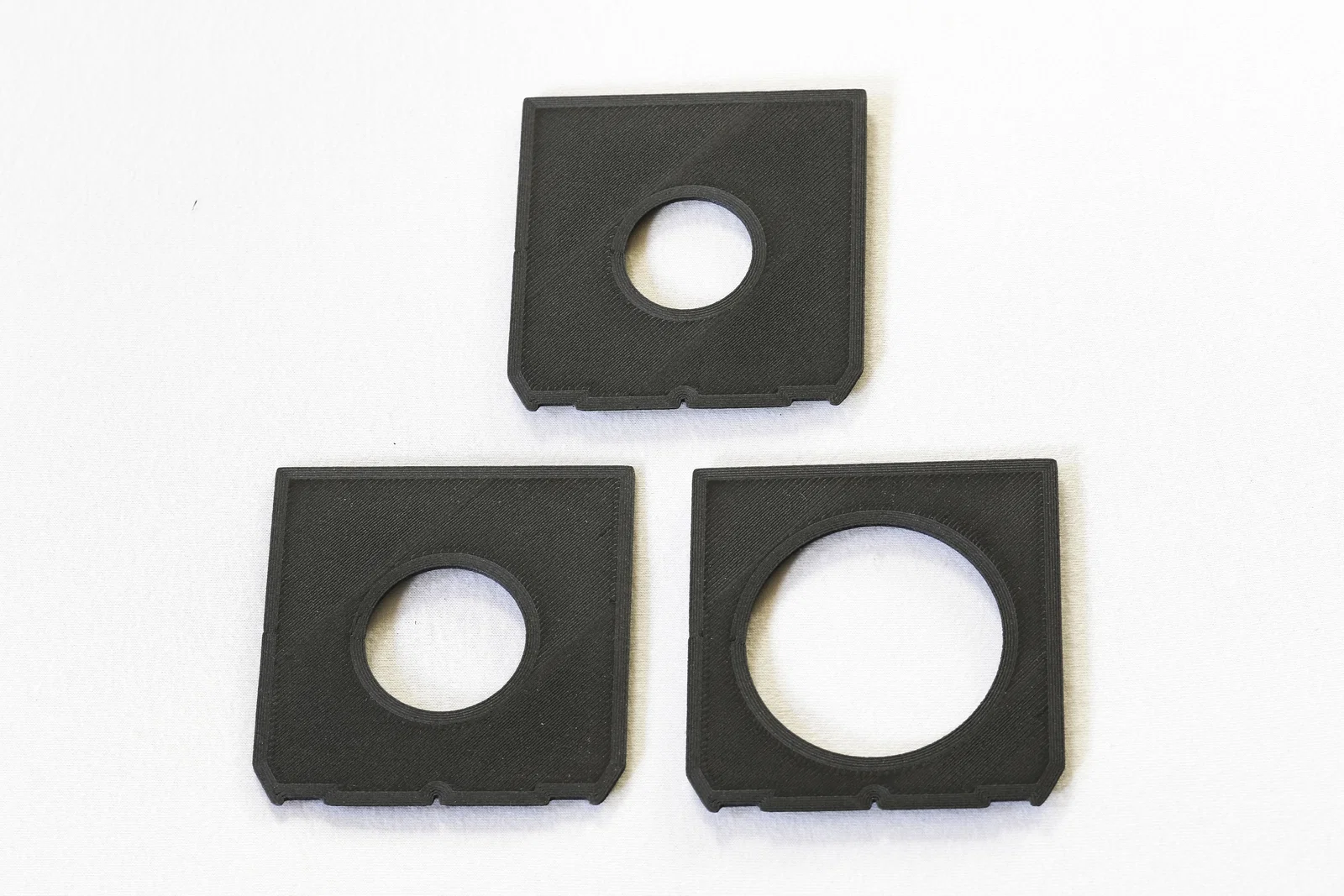Linhof style lensboard với các cỡ Copal 0, 1 và 3. Mình in bằng CF-PETG để tăng độ cứng và chống lọt sáng tốt hơn. Các vật liệu CF khác cũng dùng ổn. Trọng lượng chỉ chưa tới một nửa so với lensboard nhôm tiêu chuẩn.