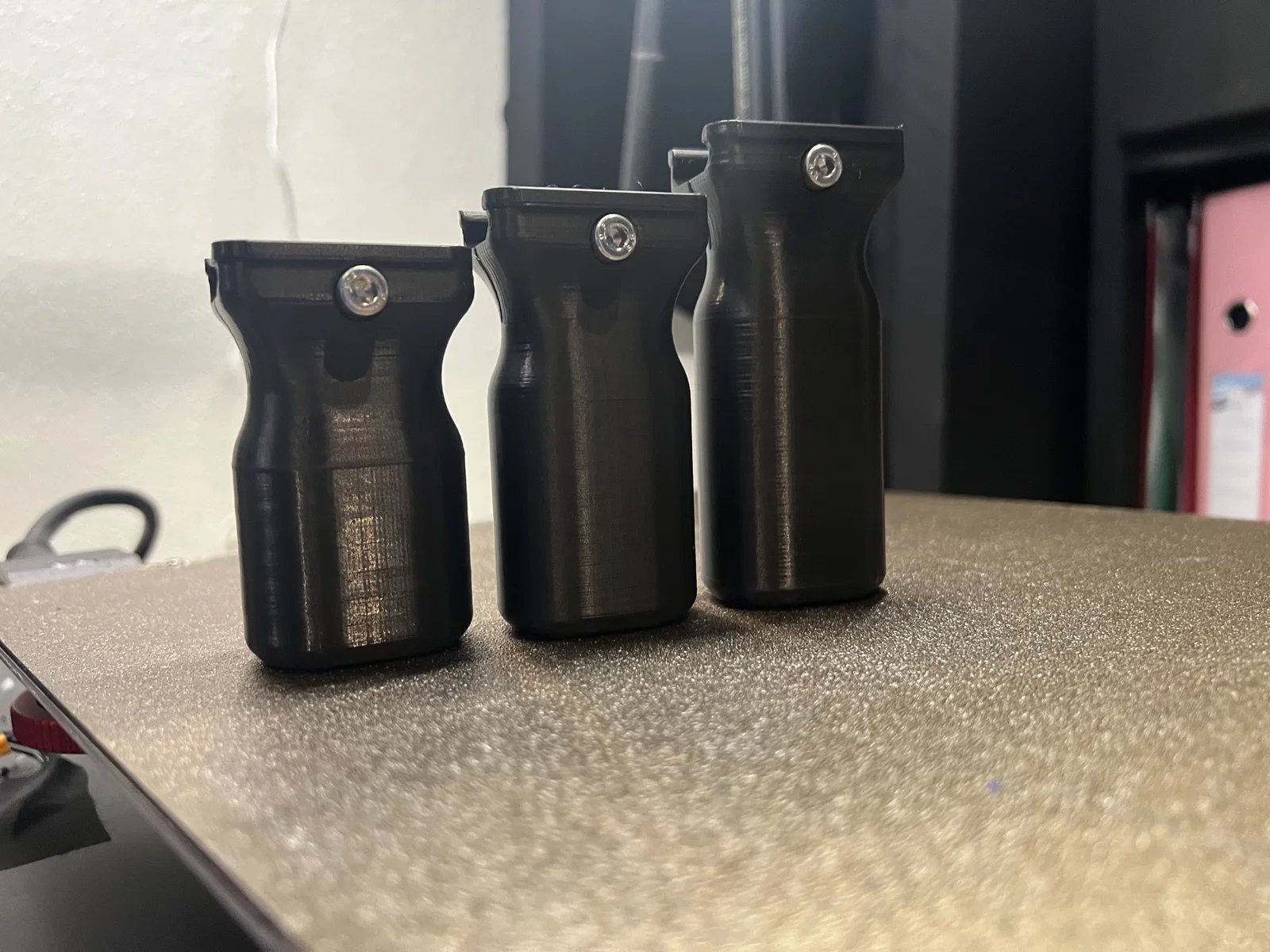 Mẫu tay cầm Airsoft (Airsoft grip) chuẩn metric 5mm, có 6 kích cỡ khác nhau. Dùng ốc lục giác 5x30 mm. Gợi ý in: nozzle 0,6 mm, 3–4 walls, layer 0,24, infill 20%, PLA + 870 3DLAC; có thể bật fuzzy skin để tăng bám.