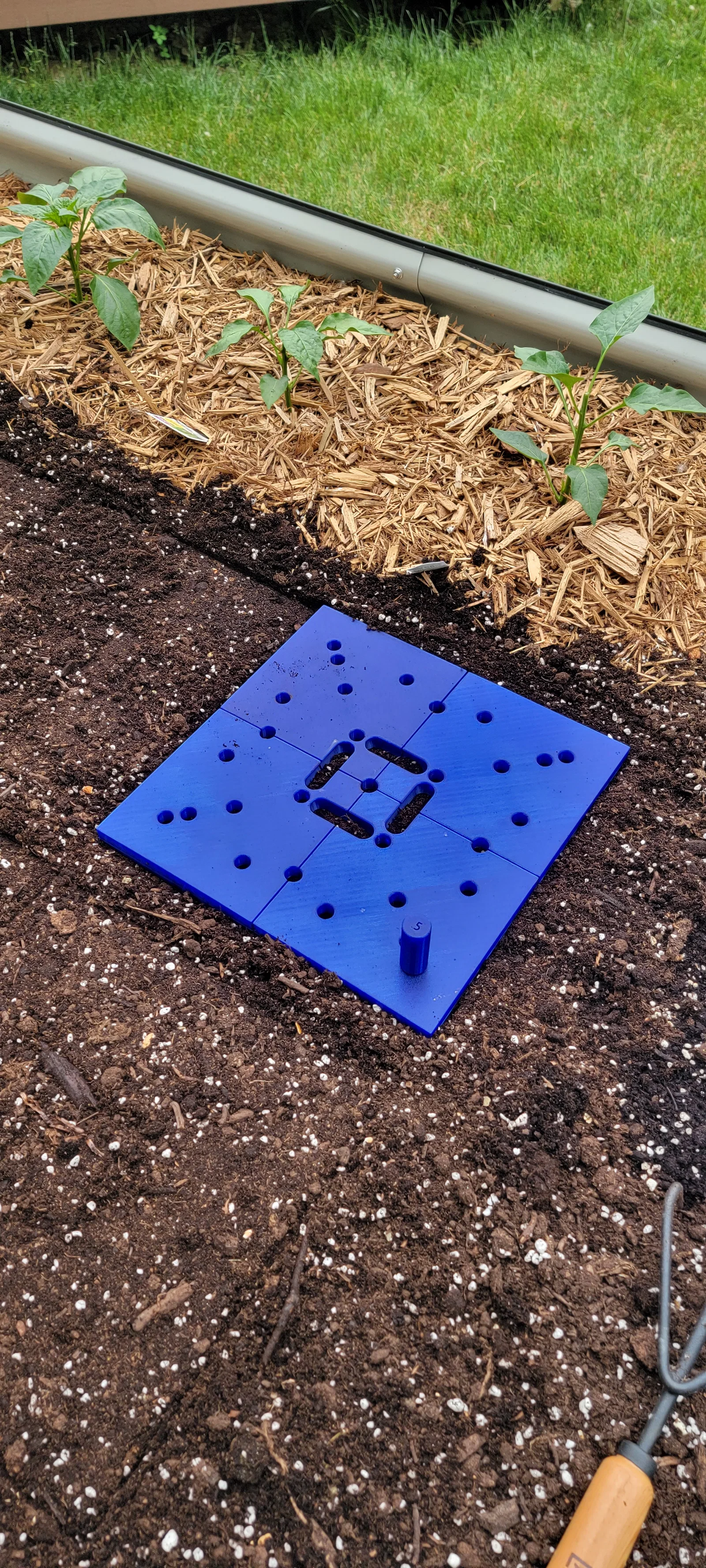 Template xài lại cho Square Foot Gardening, giúp canh khoảng cách gieo trồng theo từng ô 1 ft². Có chốt đo độ sâu hạt 0.25/0.5/0.75/1 inch. STL full 305×305mm và bản split kèm alignment pegs.