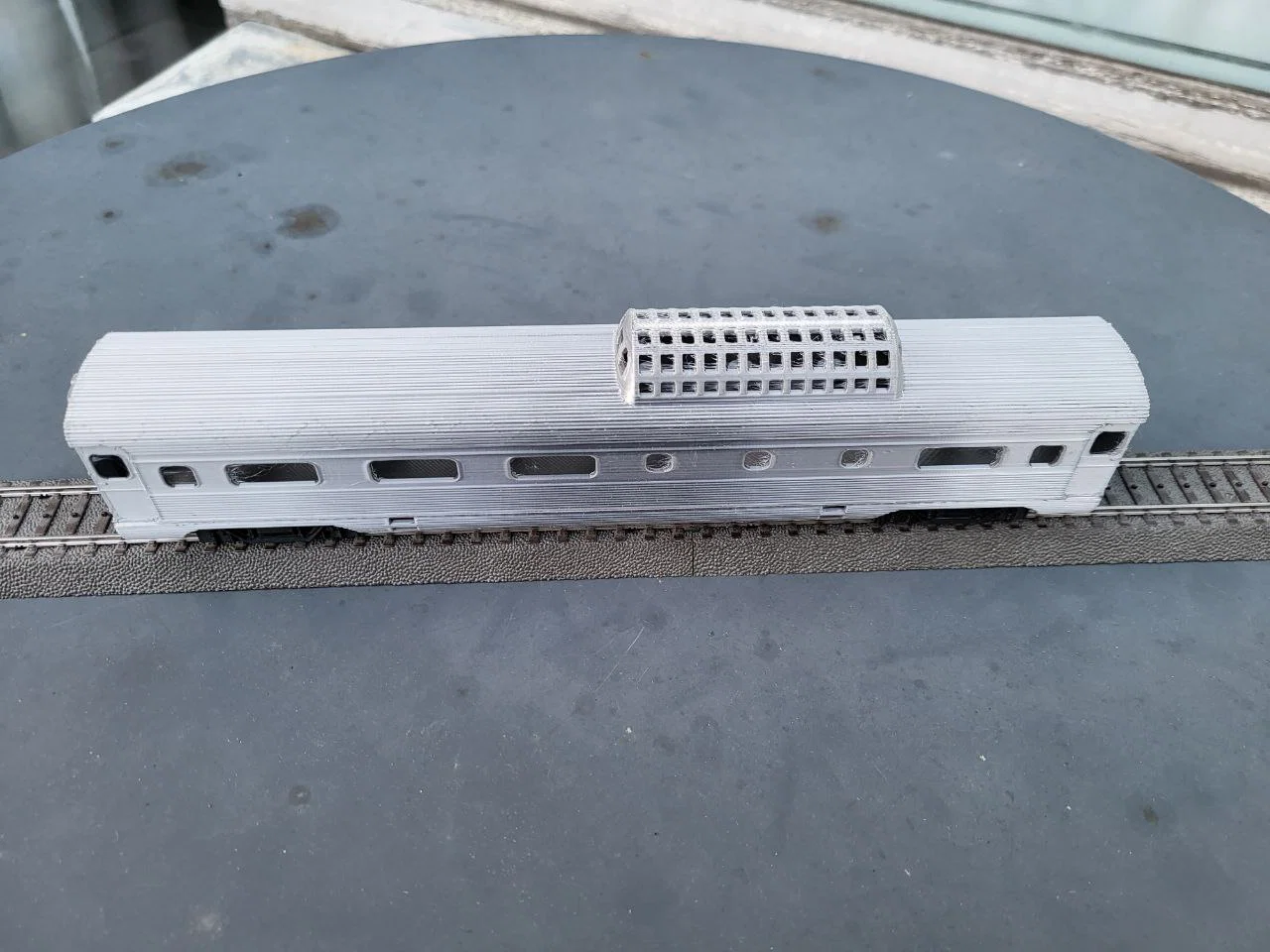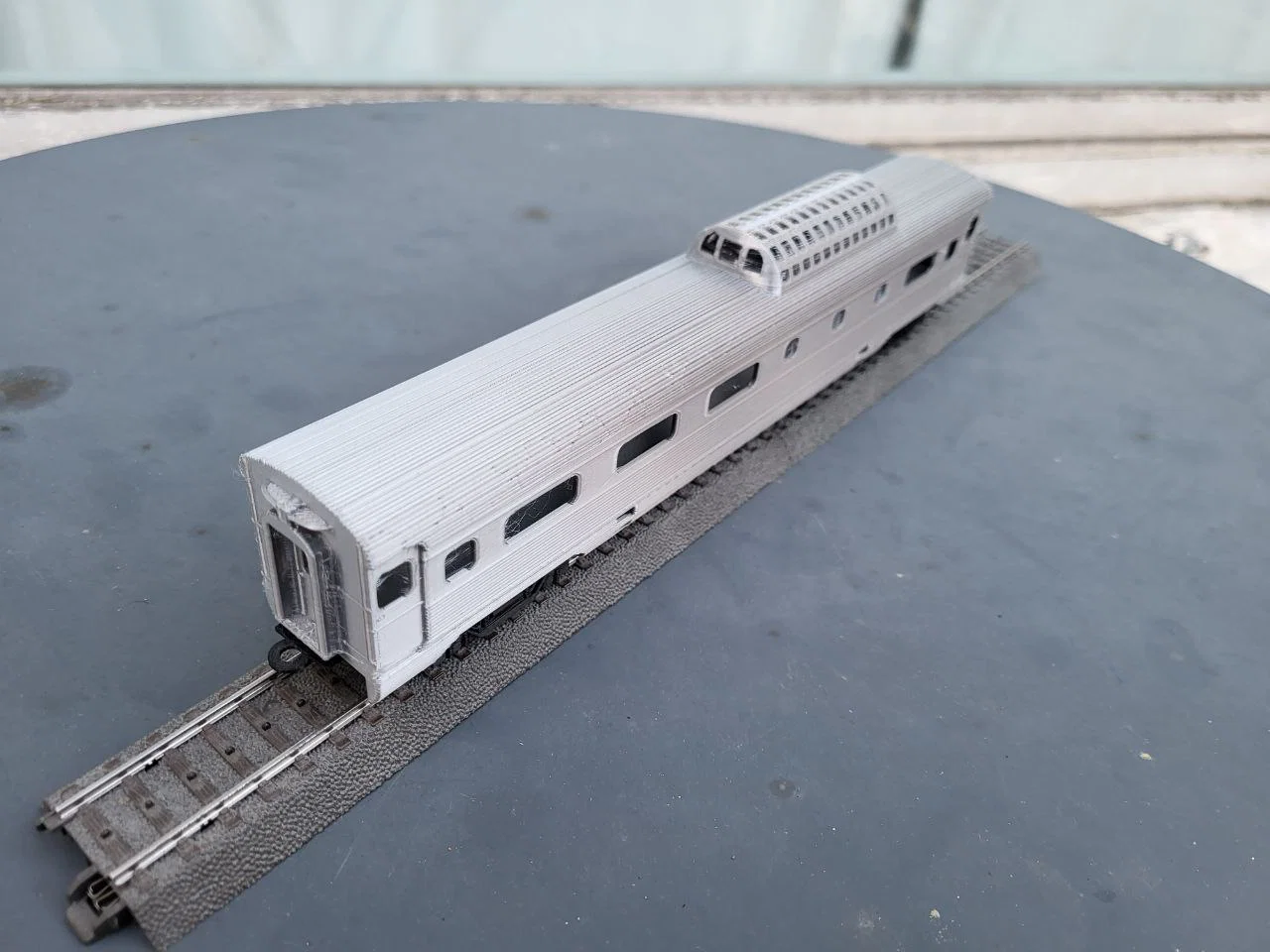Mẫu toa Vista Dome của đoàn tàu U.S. Amtrak Streamliner cho H0 scale, chạy được trên layout. Có mẹo xoay 45° để in trên Ender 3, hỗ trợ standard axles, kèm mount1/mount2 và gợi ý PLA phù hợp.