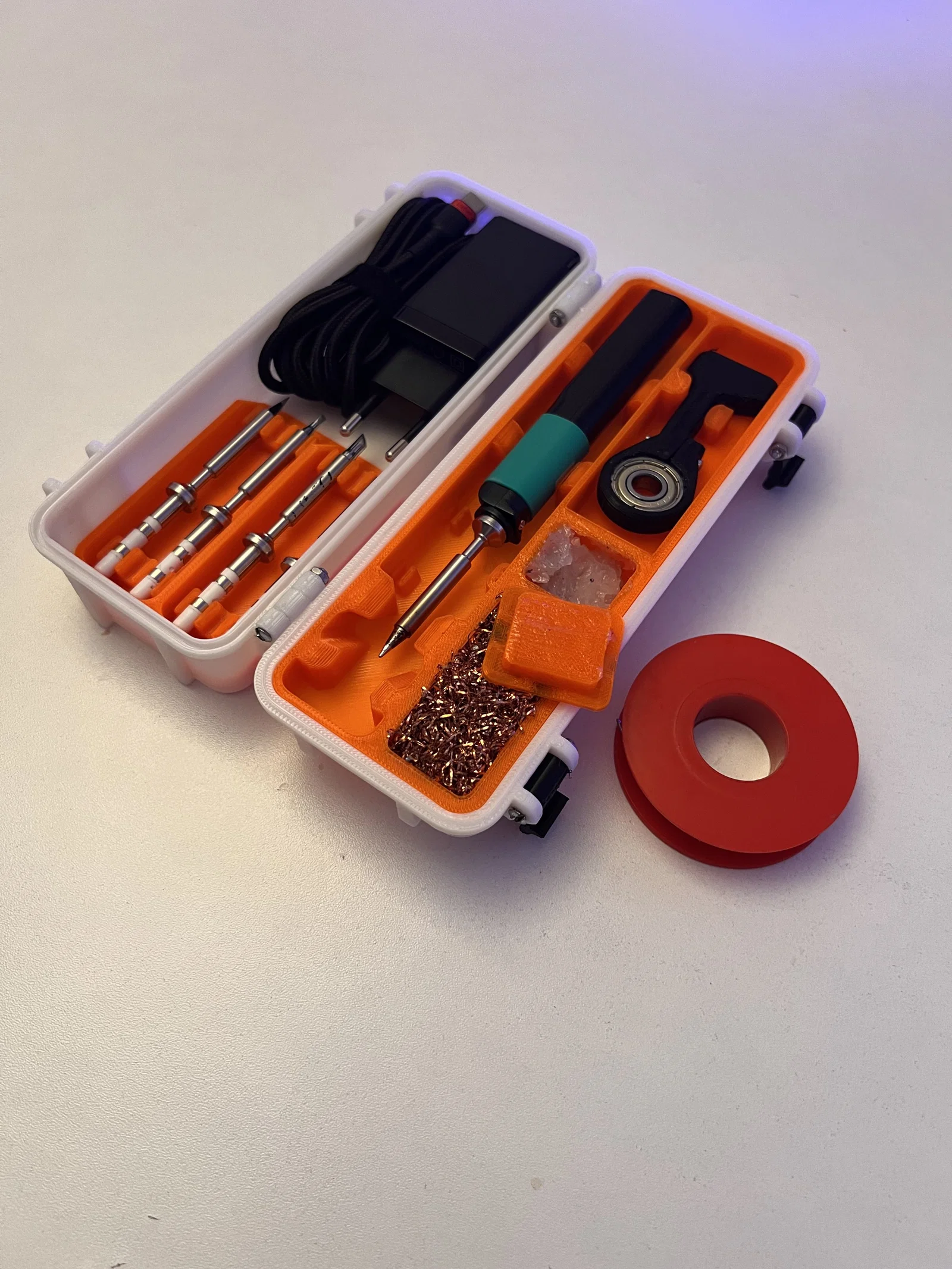 Bộ insert gọn cho hộp 2 tầng rugged dùng Pinecil/TS100/TS80 (V2). Giải pháp all‑in‑one: đựng flux, hộp vệ sinh tip, giữ tip dự phòng và nhiều thứ khác. Lưu ý dung sai máy in và chừa 2cm cho cuộn chì hàn.