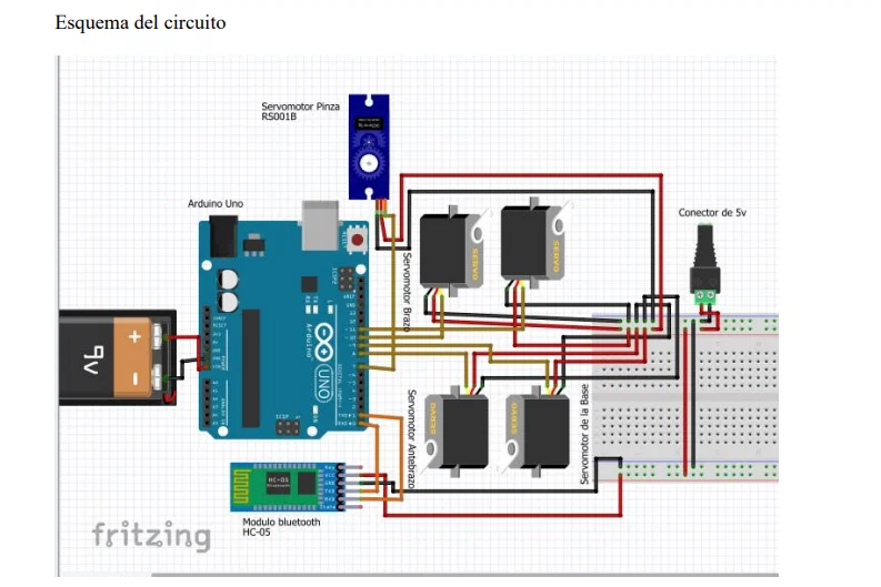 Thiết kế cánh tay robot (brazo robótico) điều khiển bằng Arduino. Vật liệu gồm chi tiết in 3D bằng PLA, 4 servomotor MG996R, 1 micro servomotor SG90, module Bluetooth HC05, ốc vít và dây jumper.