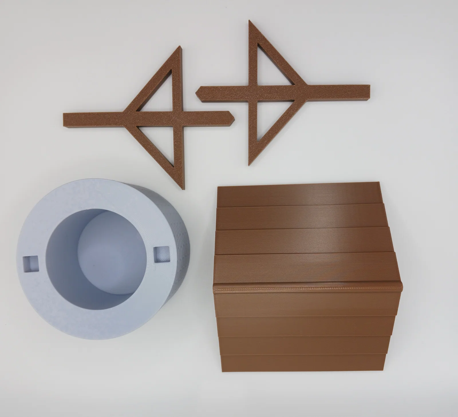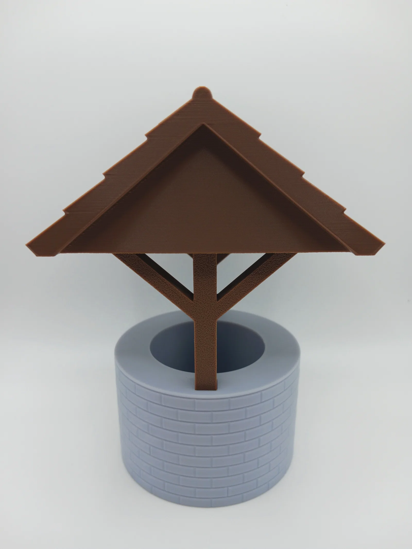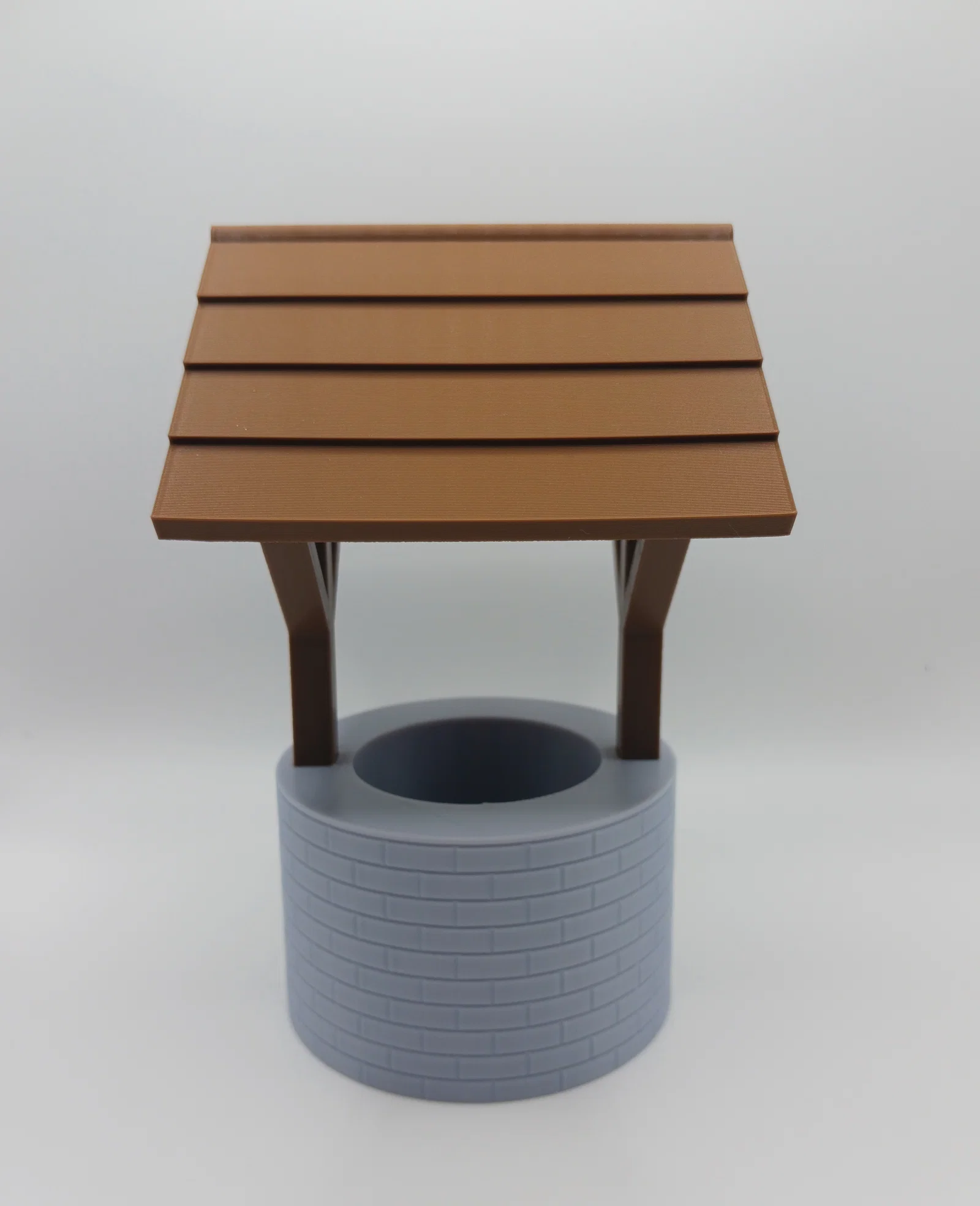 Giếng đá kiểu town này được in thành 4 phần. Nếu bạn in các cột (posts) theo đúng hướng đặt file, chúng sẽ khớp khá chặt với phần giếng đá. Nếu chặt quá thì bạn có thể chà nhẹ bằng giấy nhám. Nếu lỏng quá, chấm chút keo là ổn. Phần mái (canopy) có các rãnh nhỏ đúng vị trí để gắn cột. Bạn vẫn có thể nhấc mái ra, nhưng mình đã làm nó dính lại bằng một ít keo.