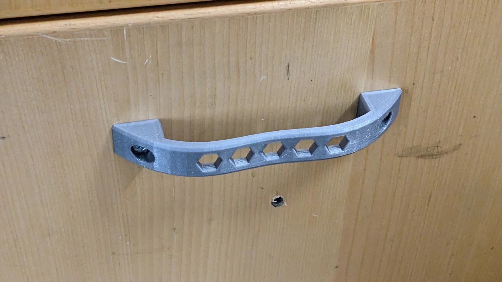 Tay nắm ngăn kéo/tay nắm cửa thiết kế lục giác (Hexagonal) dạng print-in-place. Lỗ vít 4mm có côn cho vít gỗ đầu chìm. Gợi ý thông số: MK4, 0.2 Speed, PLA, perimeter 3x, infill 30%.