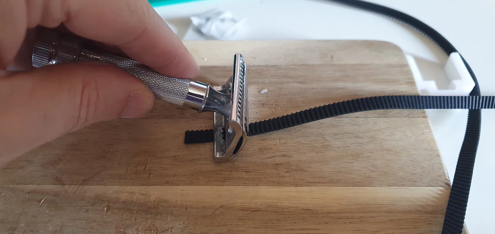 Ở một đầu belt, đánh dấu cách mép 10 răng. Dùng dao lam cắt bỏ phần răng, nhưng đừng cắt sâu hơn lớp sợi mịn bên trong (là lớp chịu lực). Mình không cắt tới tận đáy, vẫn chừa lại chút cao su. Mình thấy lưỡi safety razor cắt vật liệu rất “ngọt”. Chà nhám để phẳng và tạo nhám bề mặt.