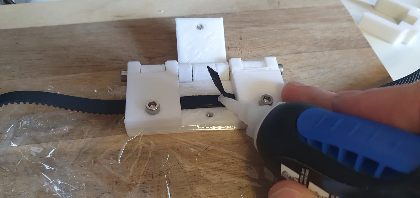 Sau khi in xong part, cắt một đoạn belt dư 60mm và dán cố định vào rãnh, để mặt răng hướng lên; nó sẽ giữ mọi thứ đúng vị trí. Bạn có thể cần khăn lau cồn (alcohol swabs) để làm sạch trước khi dán. Bạn cũng sẽ cần superglue, nó bám rất tốt trên cao su; mình dùng cụ thể Loctite Ultragel Control, loại này có rubber-toughened nên dẻo hơn và mạnh hơn. Dùng loại nào cũng được, hoặc contact cement. Lỗ làm bản lề (hinges) được thiết kế để lắp M3x30 xuyên qua mỗi đầu, vặn vào là ăn ren luôn, không cần thêm gì khác; mình dùng cho bản lề thấy rất ổn. Các faceplates được siết bằng ba con tán M3 (captured M3 nut) và ốc M3x10. Nhám 180 grit hoặc cỡ tương đương để tạo nhám hai mặt cần dán. Màng bọc nhựa (plastic wrap) để tránh superglue dính lên jig.