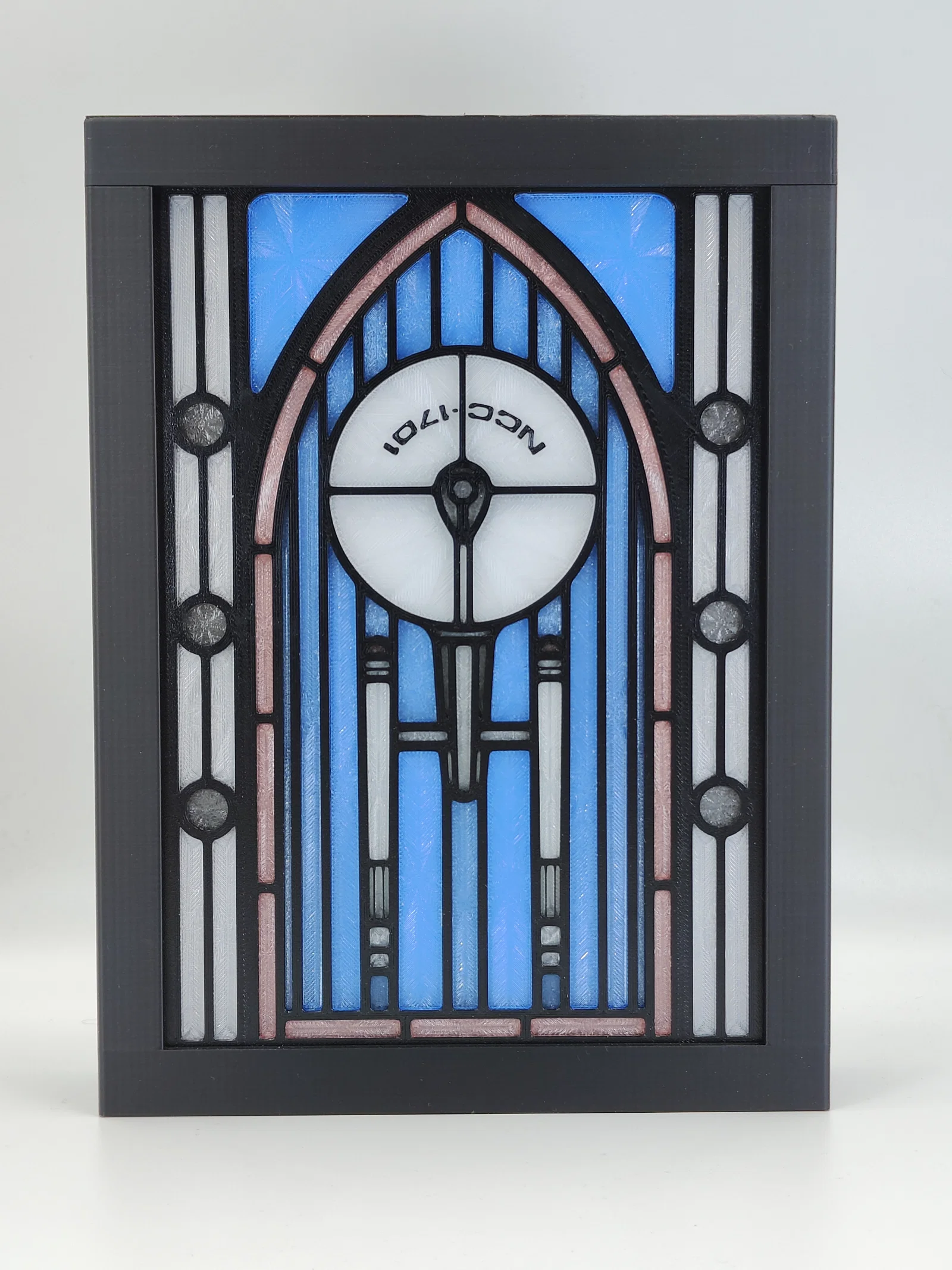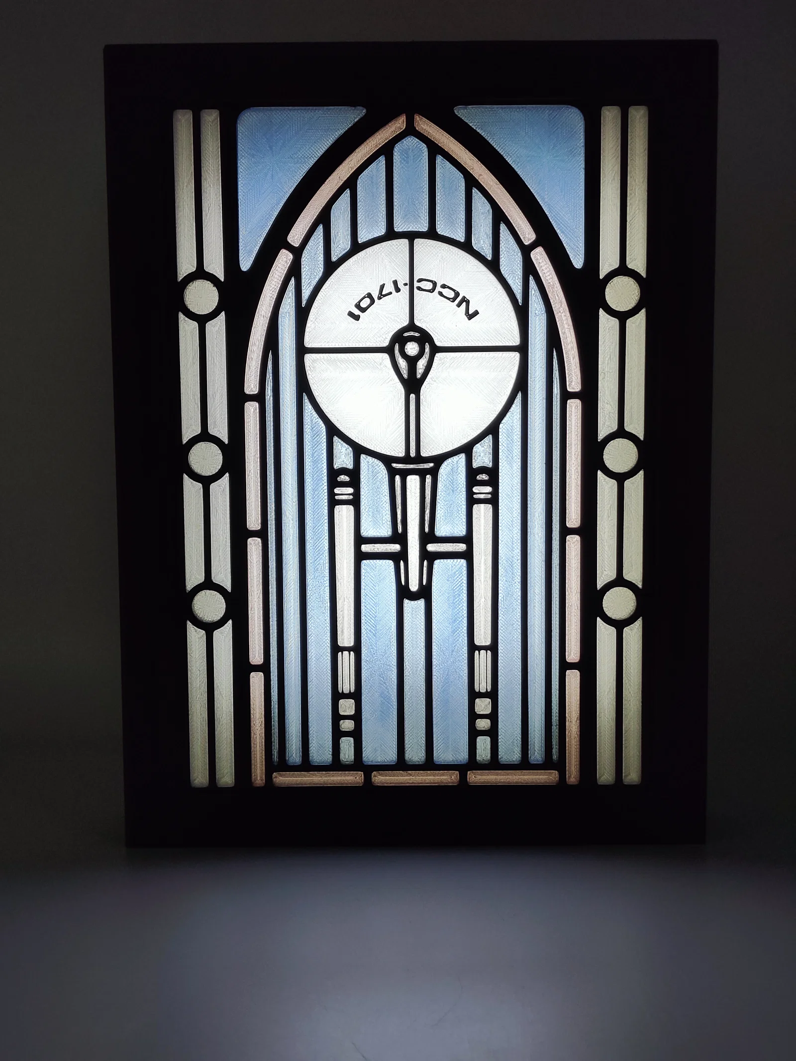Mẫu hộp đèn stained glass lấy cảm hứng từ Star Trek Enterprise (NCC-1701). Hướng dẫn vật liệu Bambu Lab (PETG/PLA), đổi màu theo layer, kèm thiết lập in và gợi ý dùng LED panel/LED strip để lên đèn đẹp.